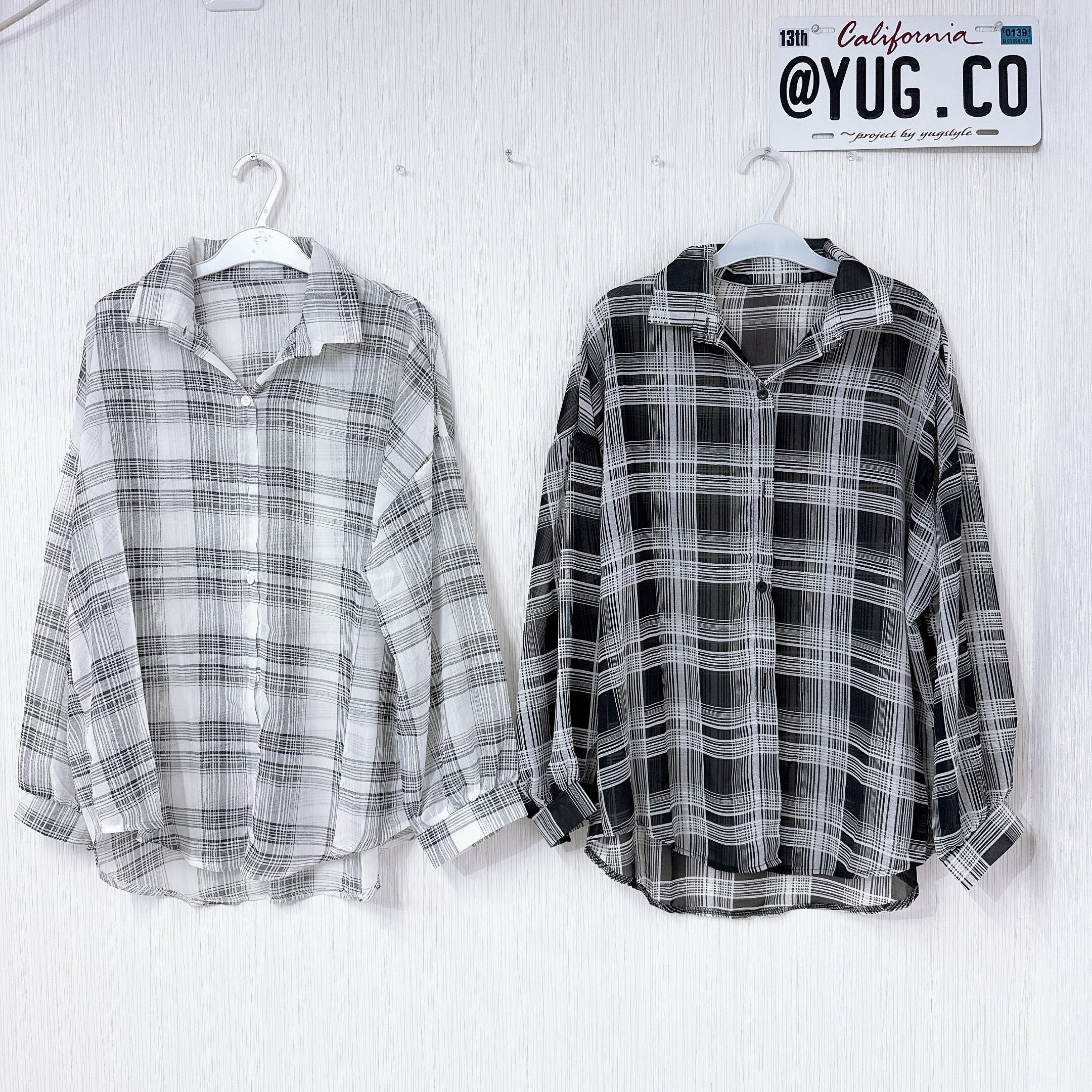 チェック柄 モノトーン シアーシャツ シースルー シフォンシャツ