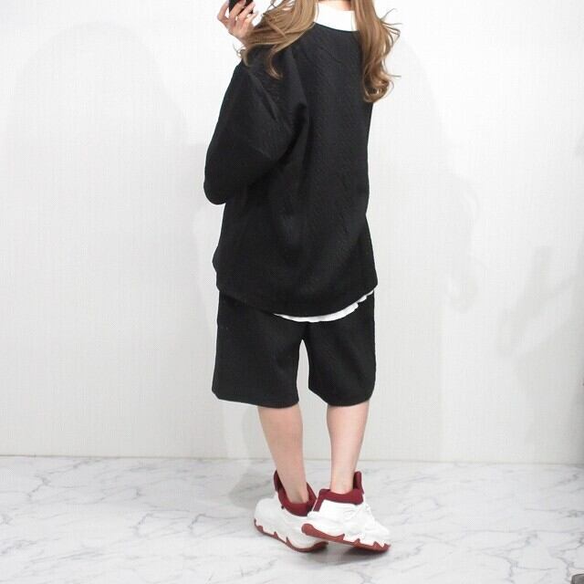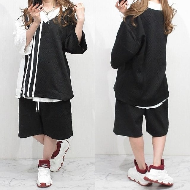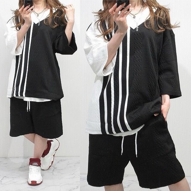 【SET UP】エンボス バイカラー VネックTops&パンツ 上下セットアップ インポート