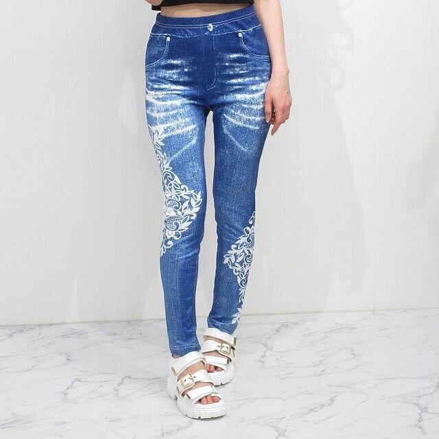 リアルデニム柄 Sideペイズリー柄 ビンテージ 美脚ストレッチレギンス