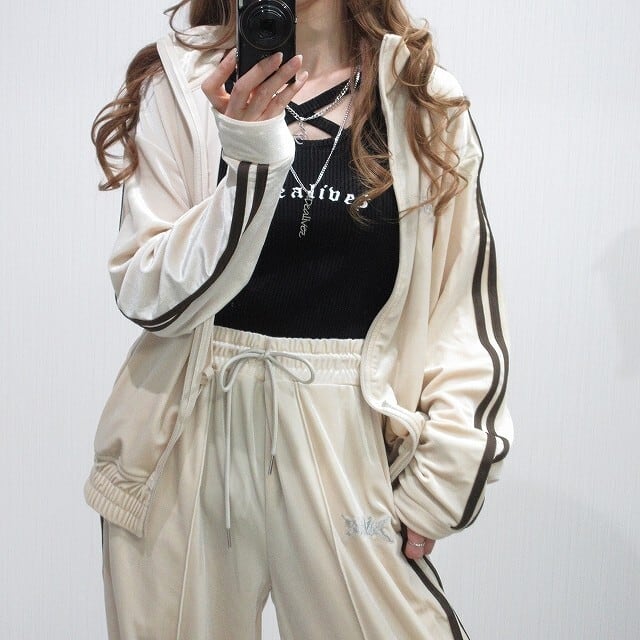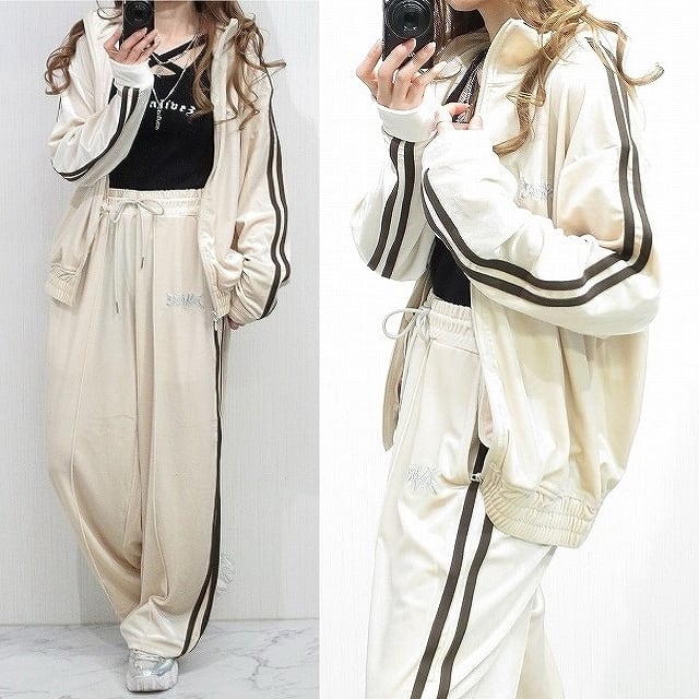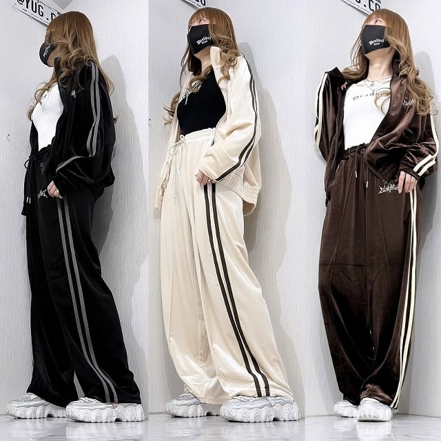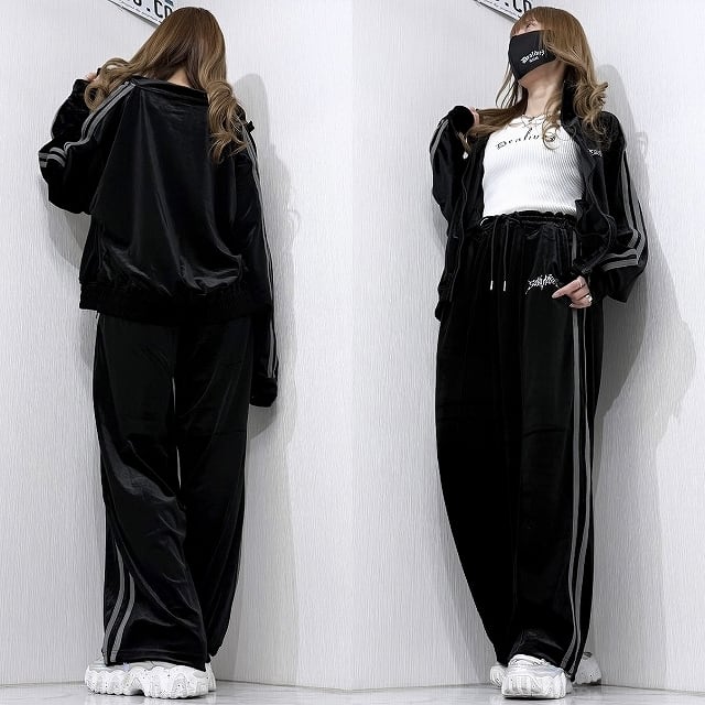 【SET UP】上下セット 上品ベロア 刺繍&Sideライン 立襟ZIP & パンツ