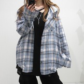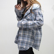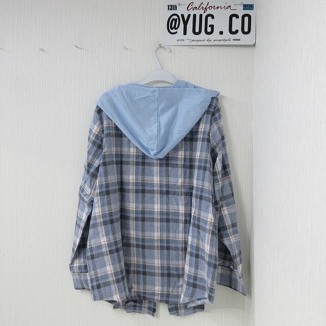 チェック柄 フード付き 異素材MIX BIGシルエット オーバーシャツ Blue