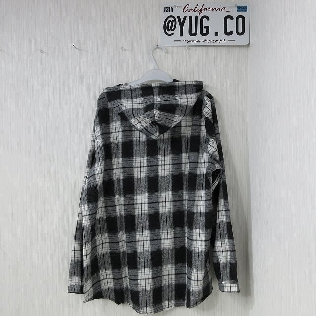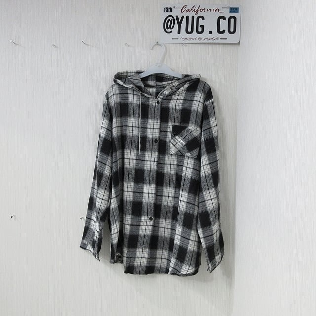 チェック柄 フード付き BIGシルエット オーバーシャツ BK