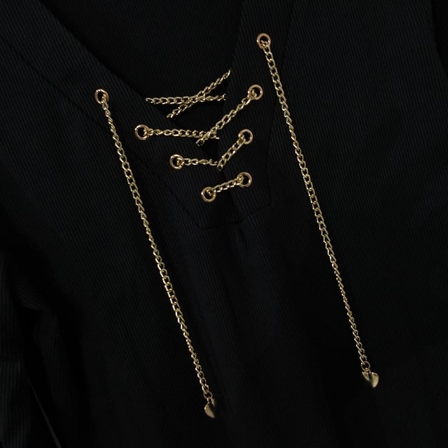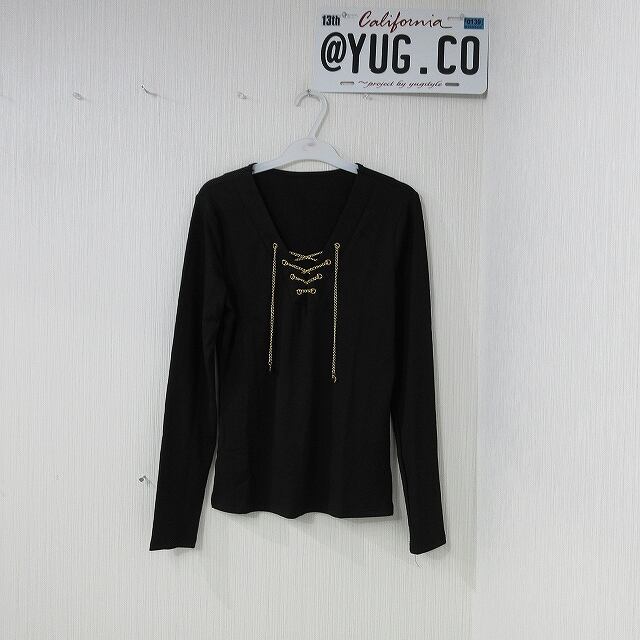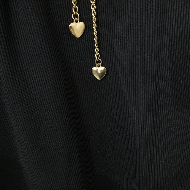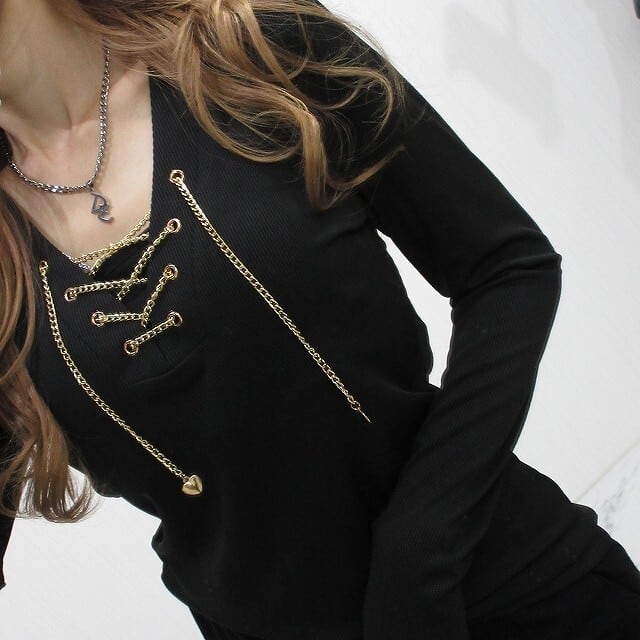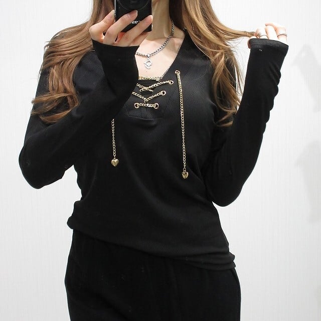 Front編み上げ ハートチャーム付きチェーン 胸元あき 肌魅せ カットソー インポート