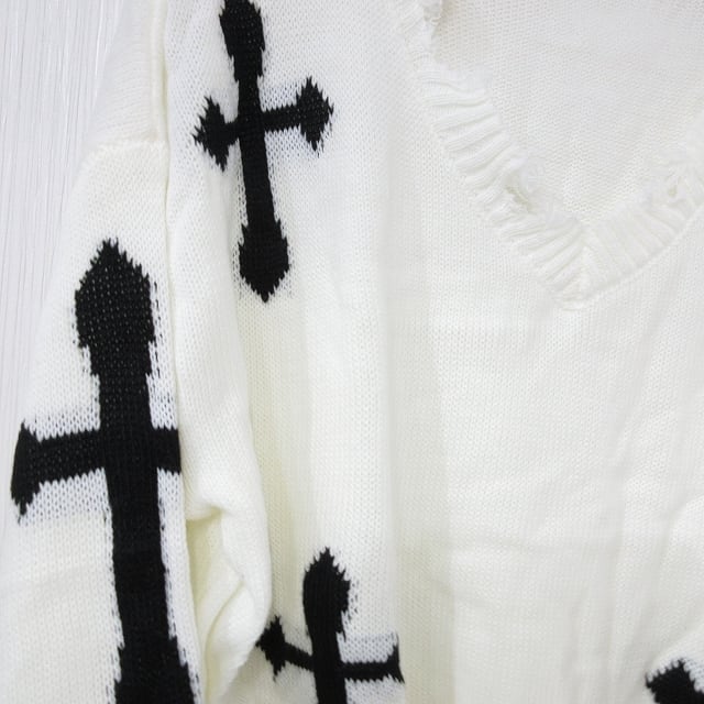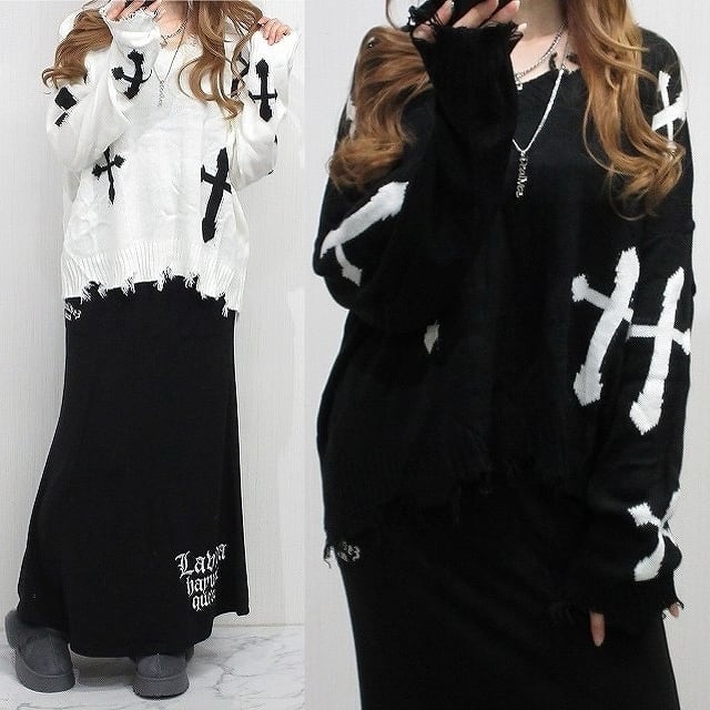 クロス 十字架 バイカラー ダメージニット オーバーニット
