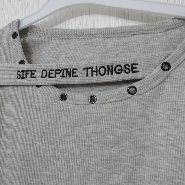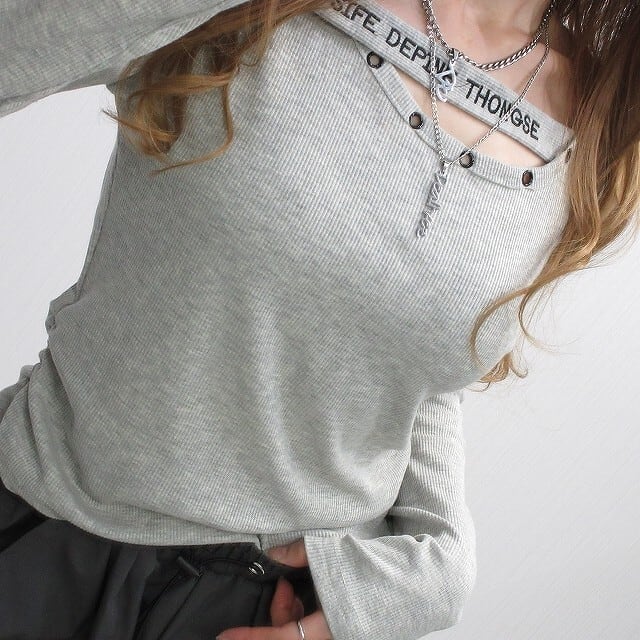 胸元あき ベルトALL刺繍ロゴ 肌魅せ ストレッチリブ カットソー インポート