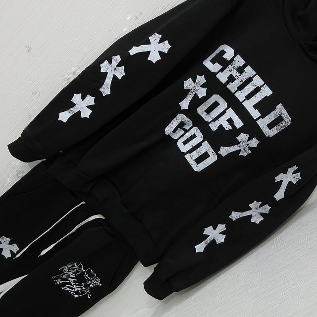 【SET UP】ストリート クロス 十字架 ロゴ パーカー&パンツ 上下セットアップ