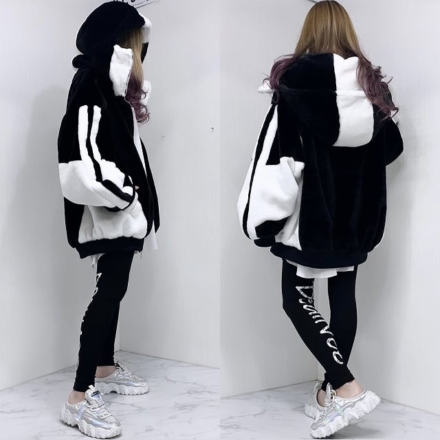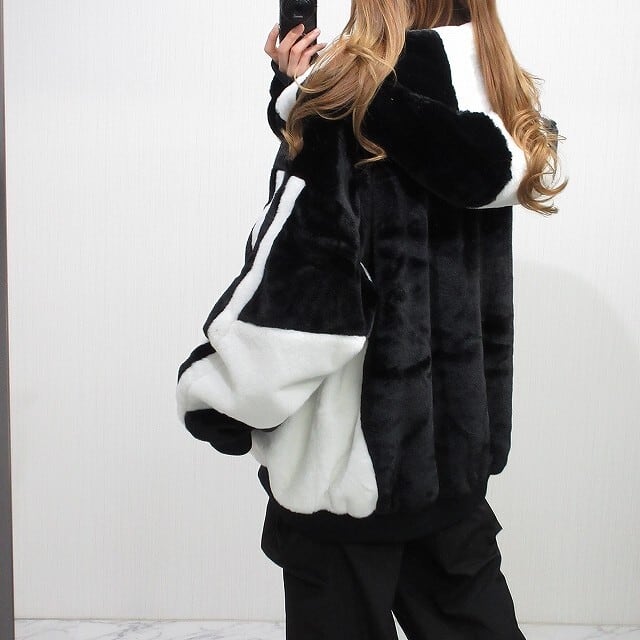ハイネックZIP バイカラー配色 ボリュームBIGフード 極上 光沢 ファージャケット オーバーサイズ 男女OK