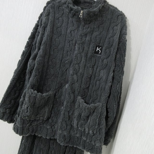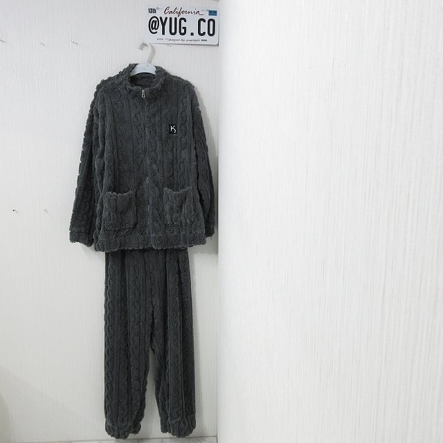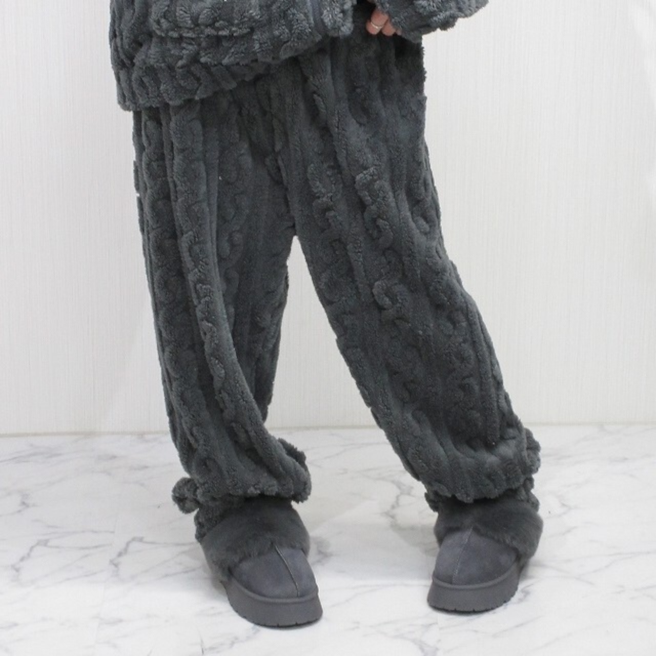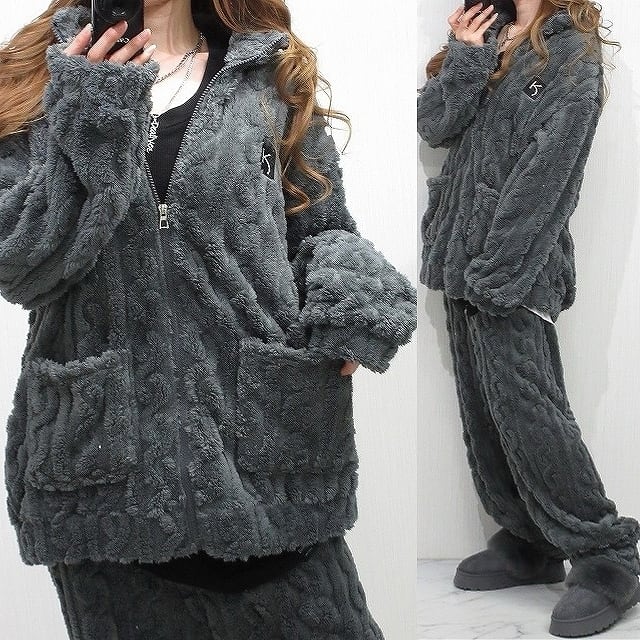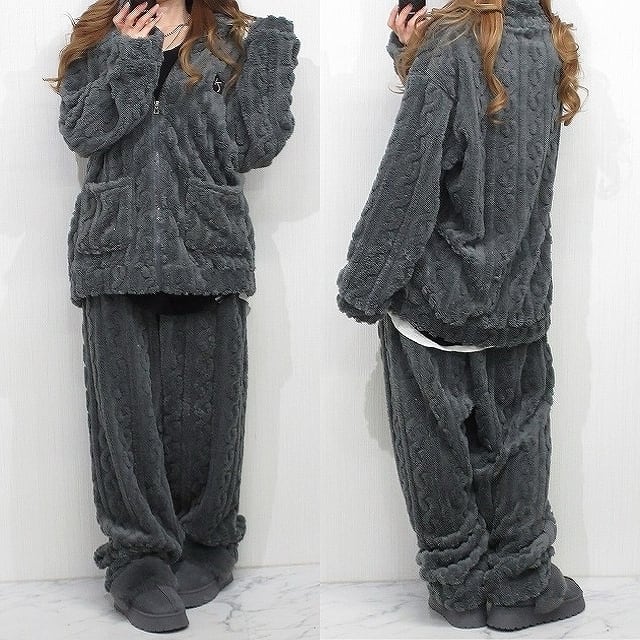 【SET UP】エンボス 波柄シャギーボア もこもこ ボリュームボア ハイネックZIP Tops&パンツ 上下SET