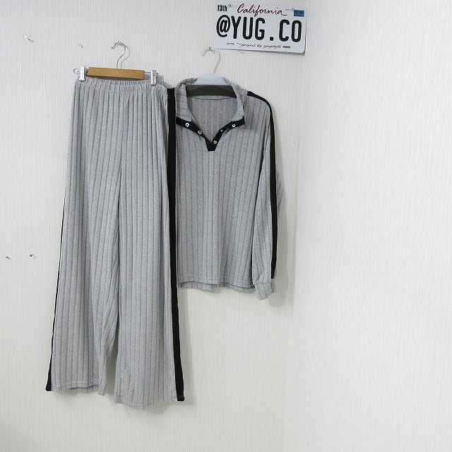 【SET UP】ハーフ釦開閉OK ストライプエンボス ニットソーTops&パンツ 上下SET