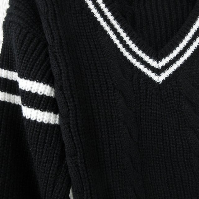Vネック ケーブル編み 肉厚 バイカラーライン ゆるかわ ニット OPワンピ