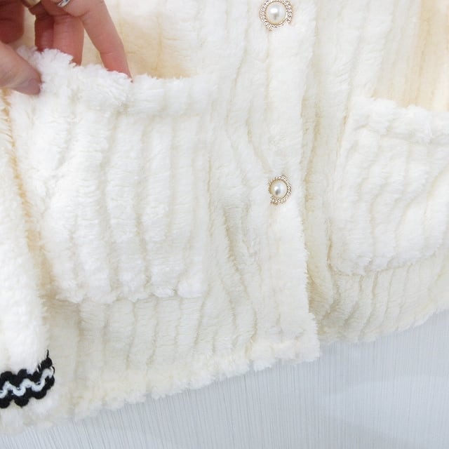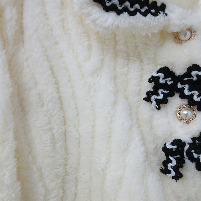 エンボスなふわふわ生地に大粒パール釦&ステッチ刺繍&リボンモチーフでかわいいデザインが◎