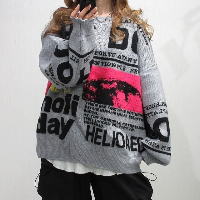 総柄 ポイントカラー配色 オーバーシルエット ニット