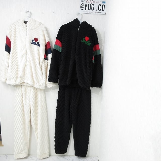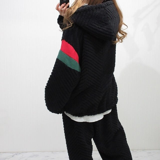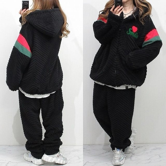 【SET UP】サガラ刺繍 袖配色切替 極暖 エンボス シープボア もこもこ ボリュームボア ハイネックZIP パーカー&パンツ 上下SET