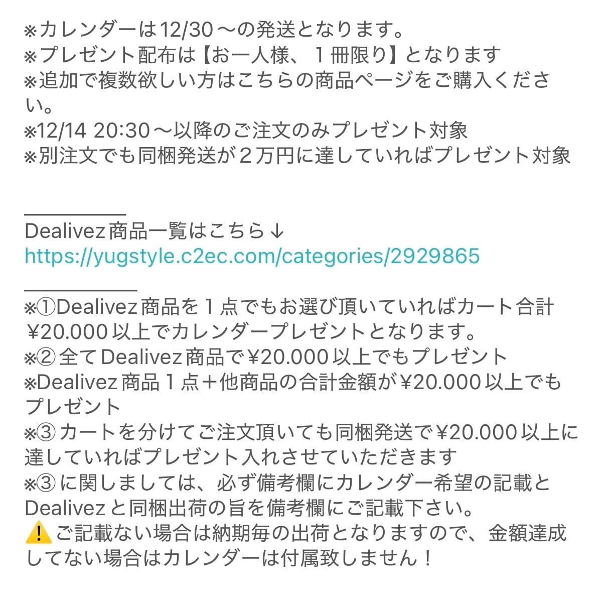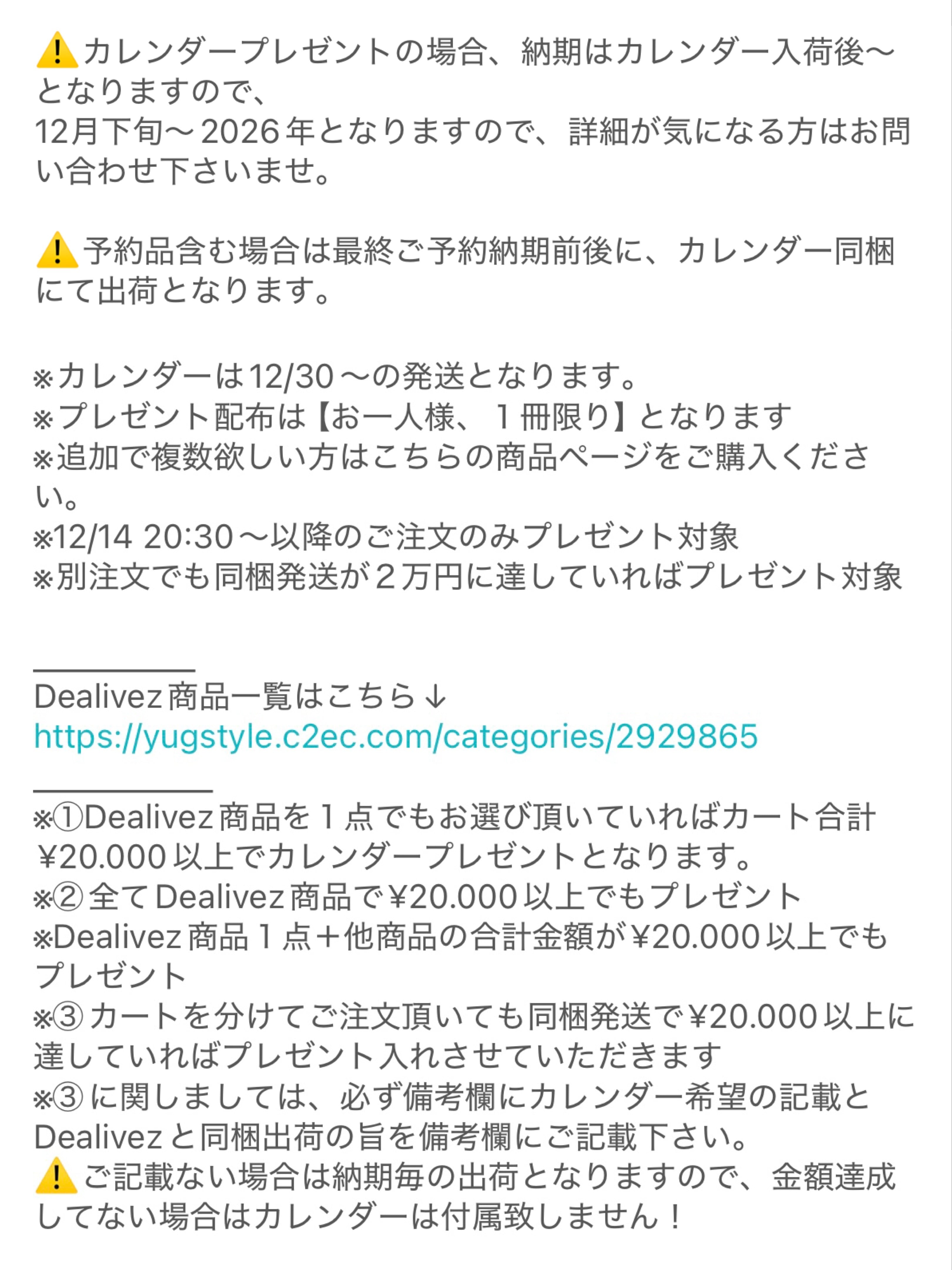 ※①Dealivez商品を1点でもお選び頂いていればカート合計¥20.000以上でカレンダープレゼントとなります。