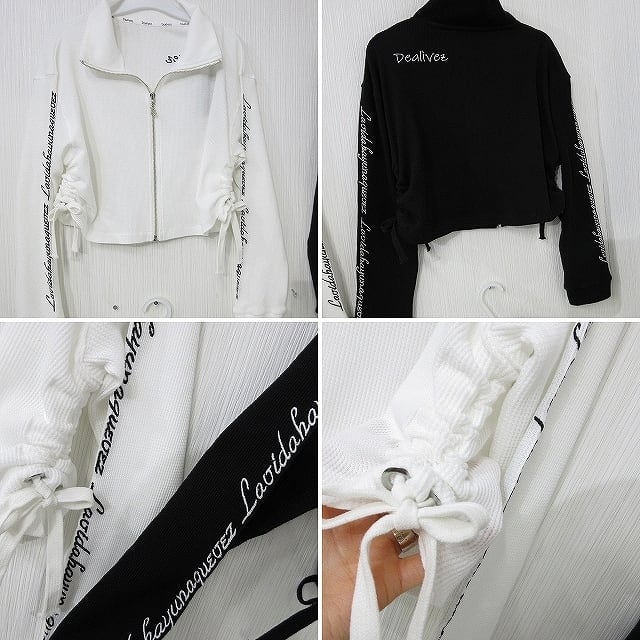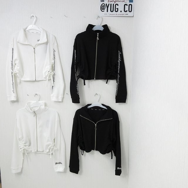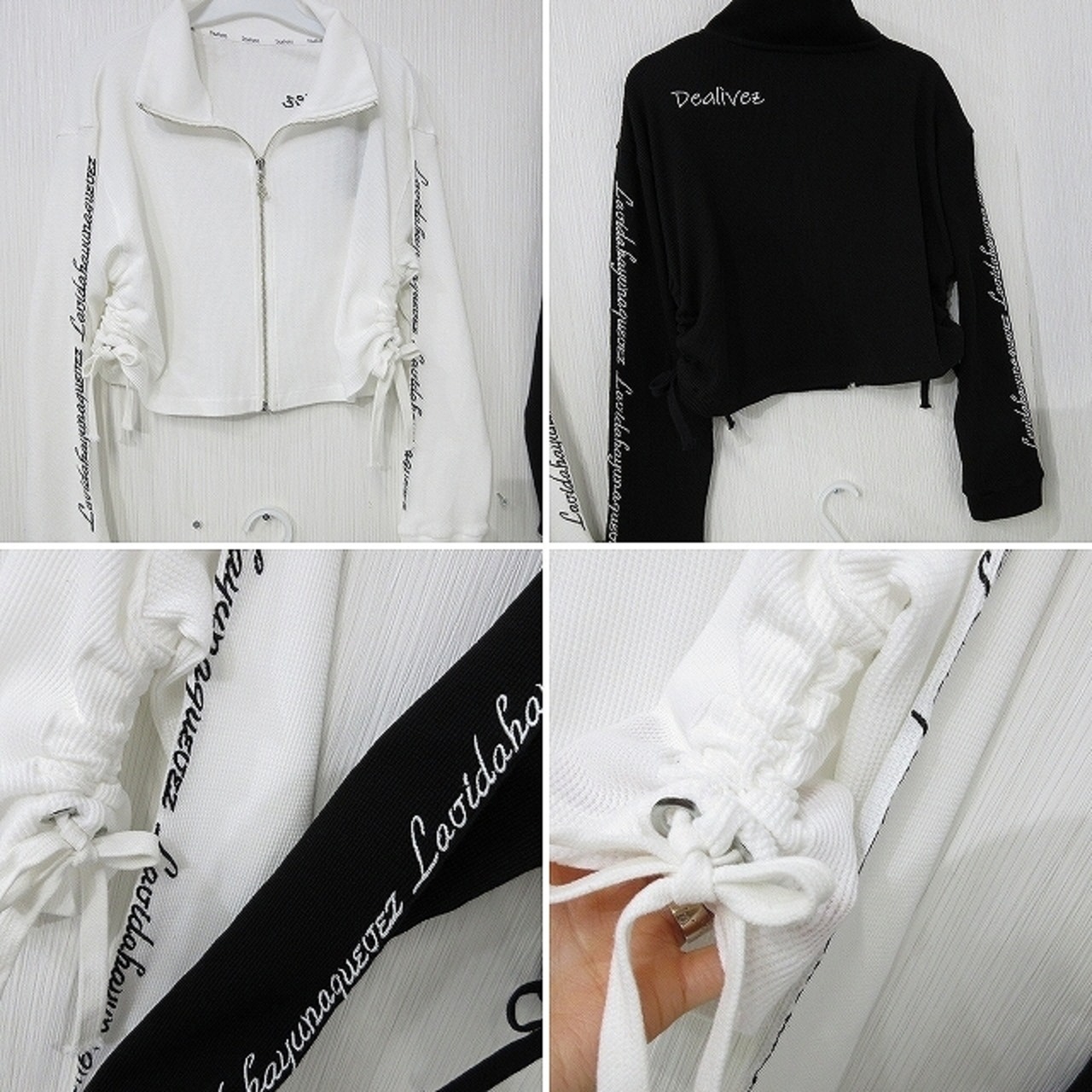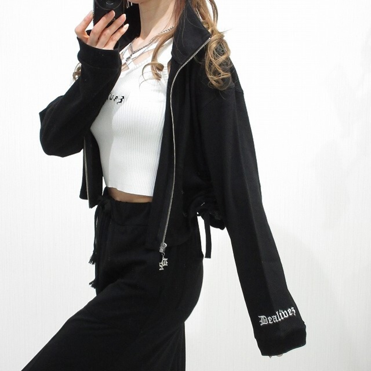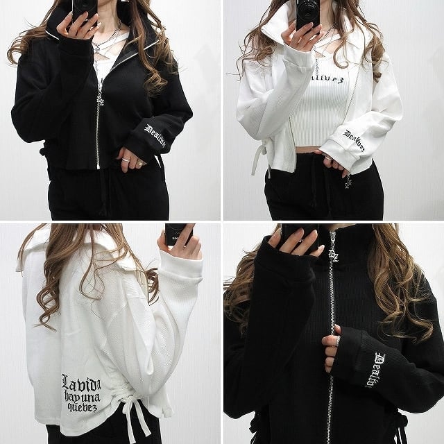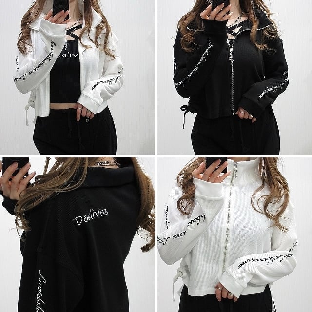 【Dealivez】ハイネックZip ワッフル地 Sideシャーリング ALL刺繍 ZIP ジャケ JK チャーム付 スタンドBIG襟
