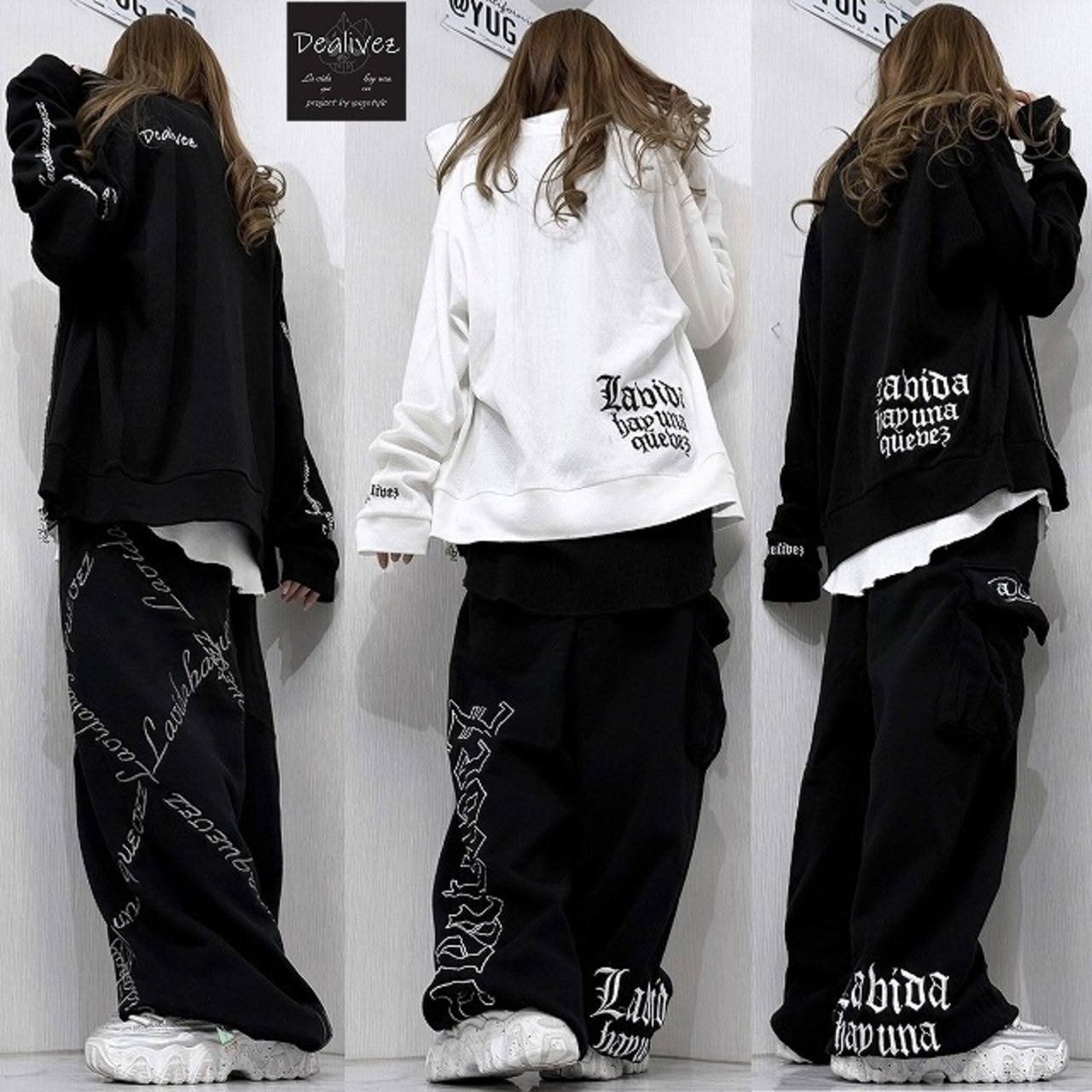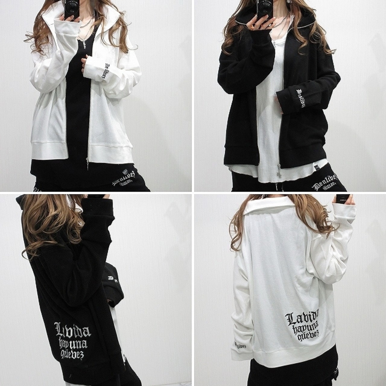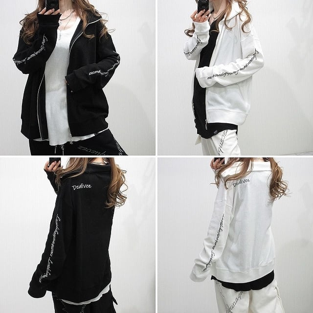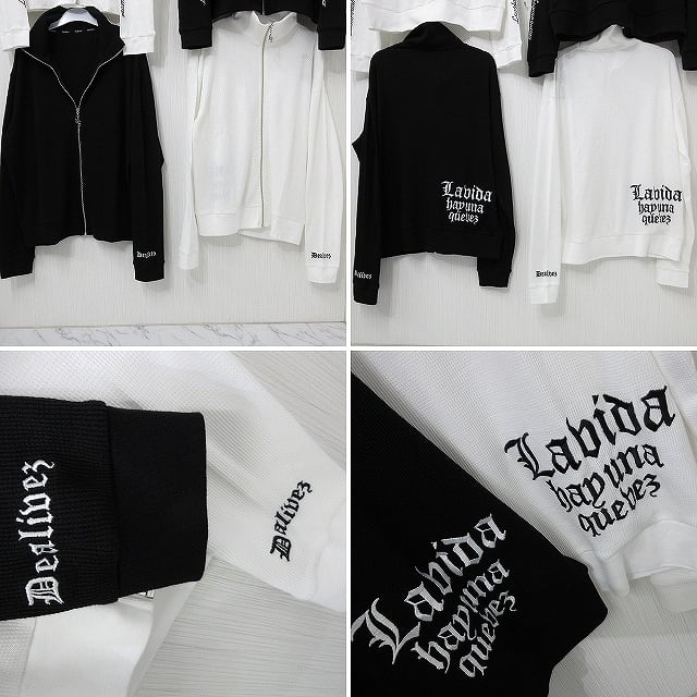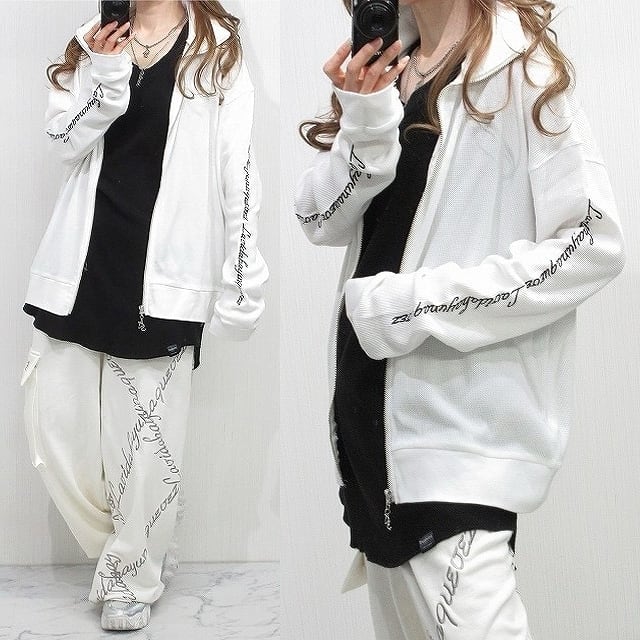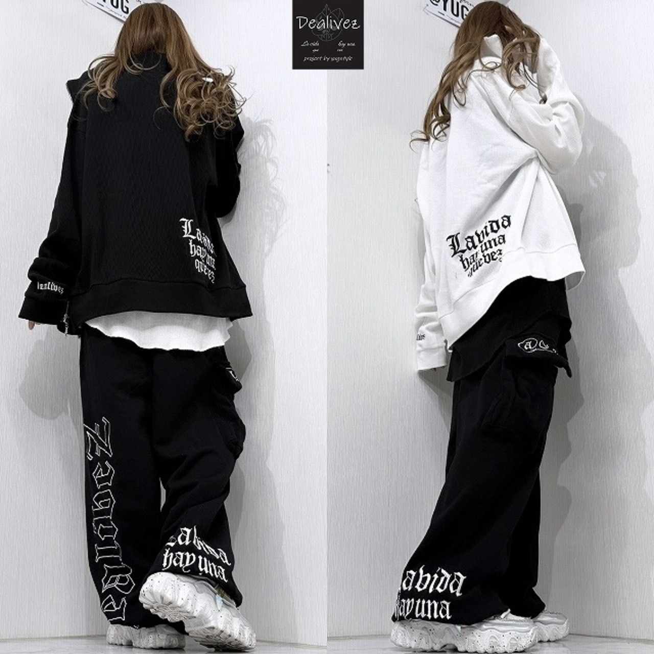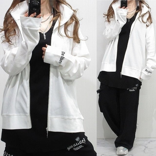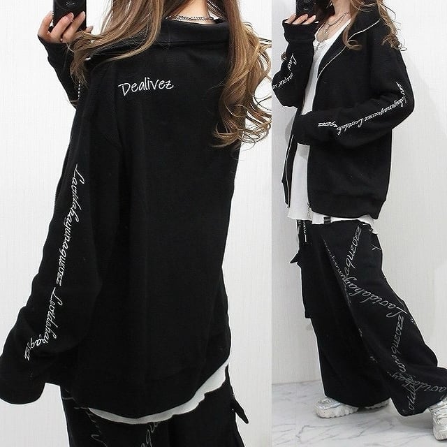 【Dealivez】ハイネックZip ワッフル地 ALL刺繍 ZIP ジャケ JK チャーム付 スタンドBIG襟 BIGシルエット