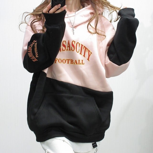 配色切替 Frontロゴ 袖ロゴ Frontポケット ハイネックレイヤード BIGパーカー