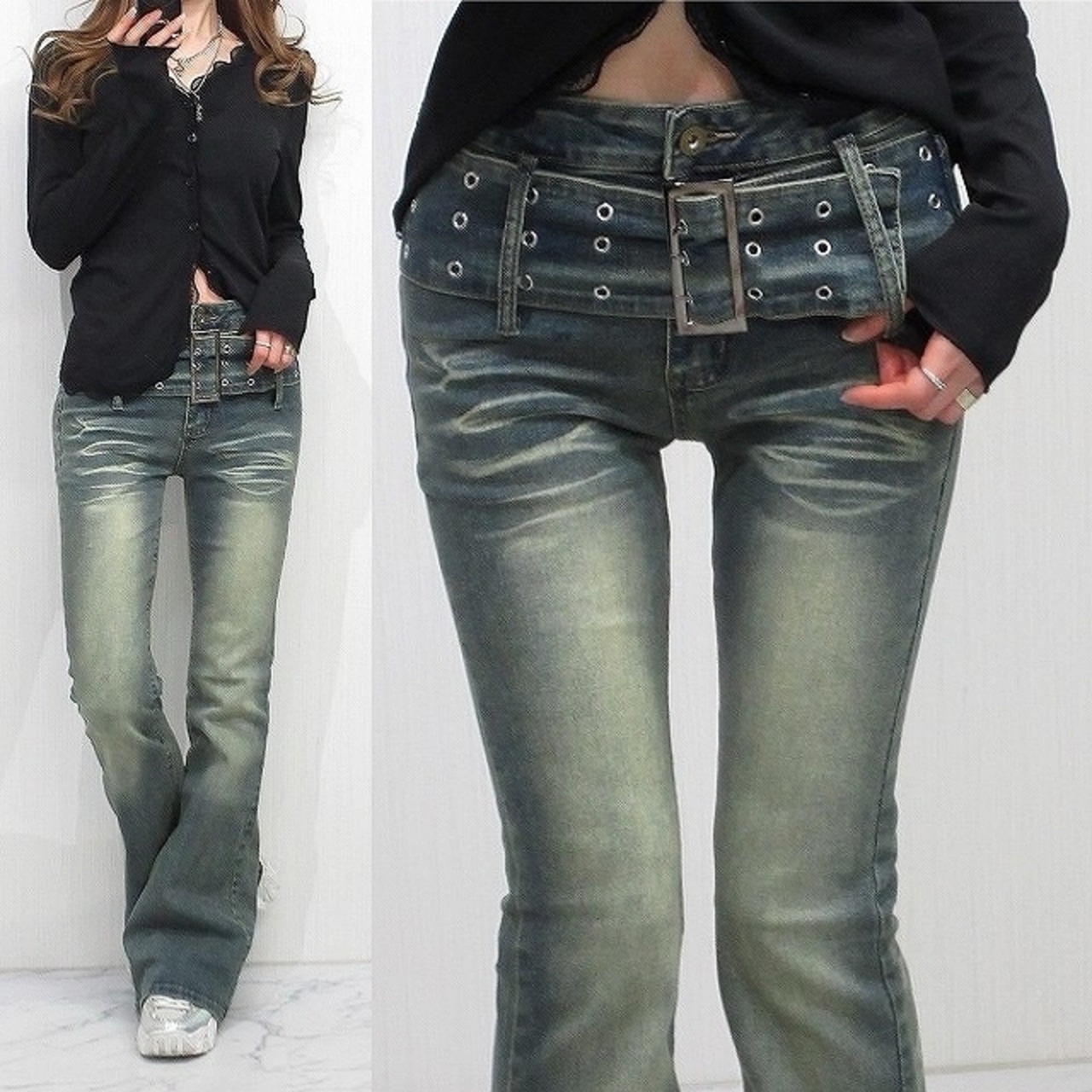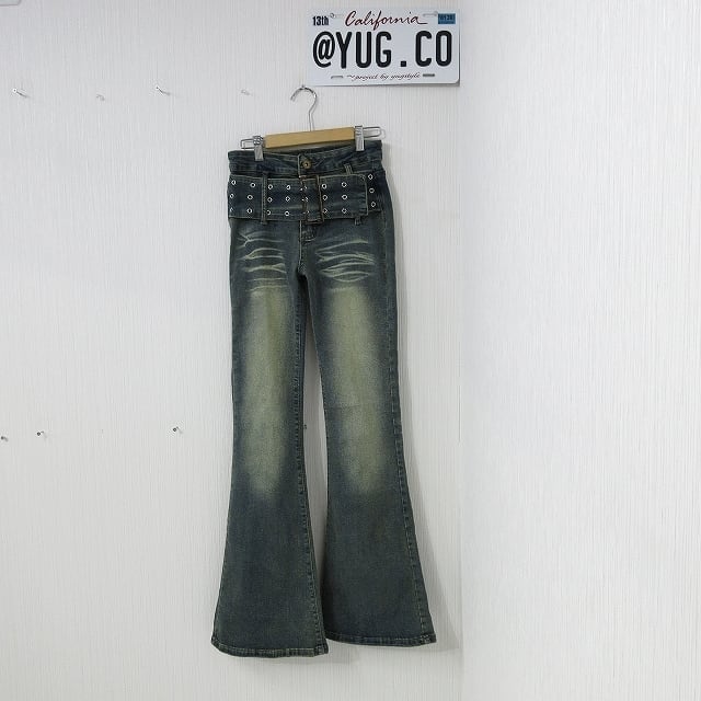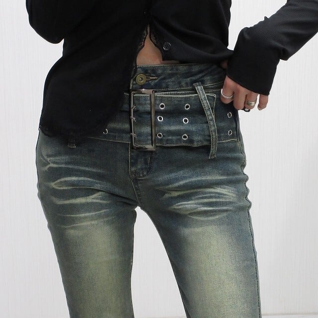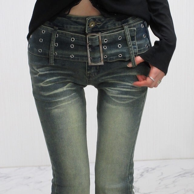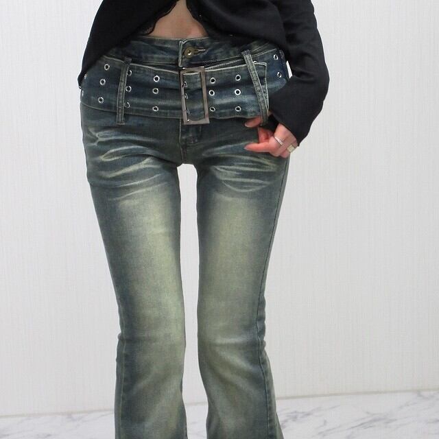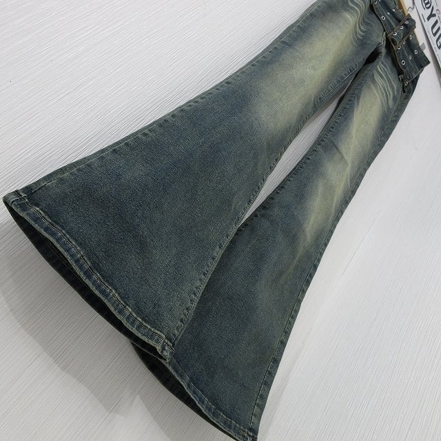 ベルト一体型 小尻効果◎ 美脚脚長 ストレッチ ベルボトム デニム