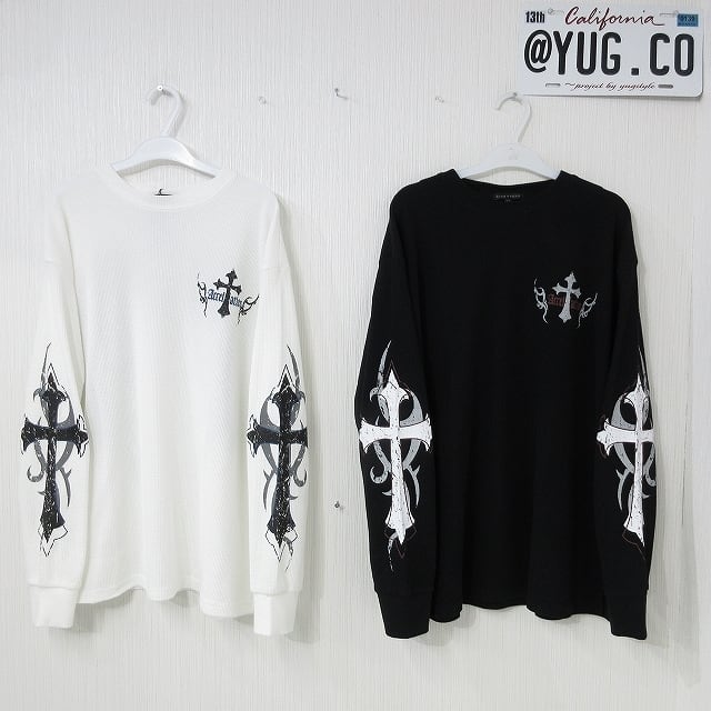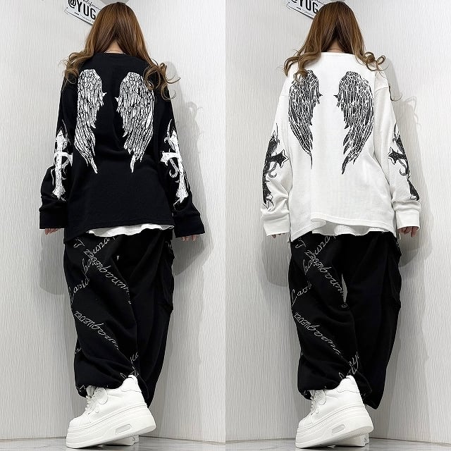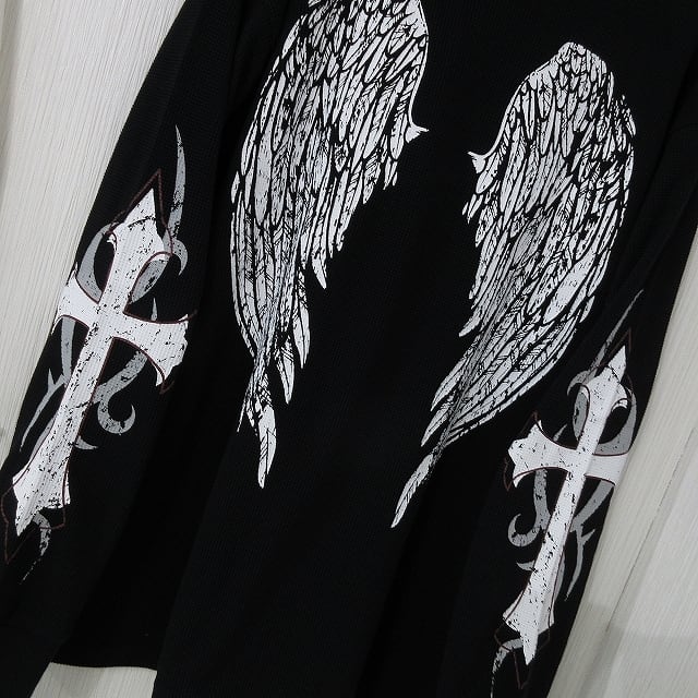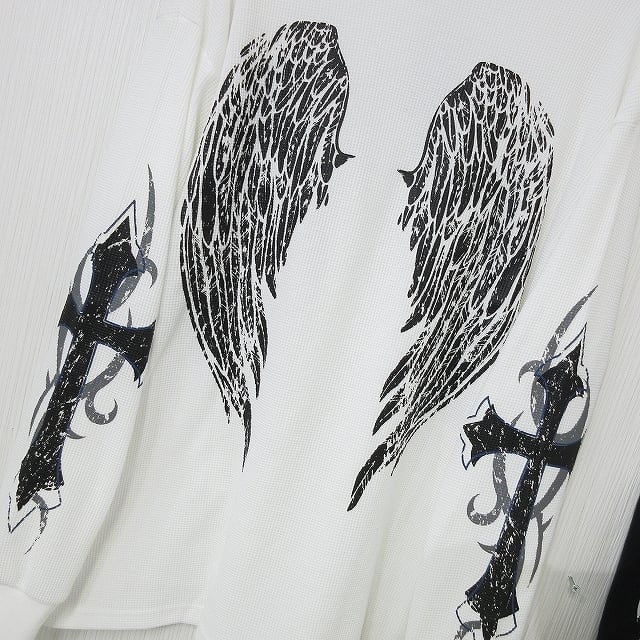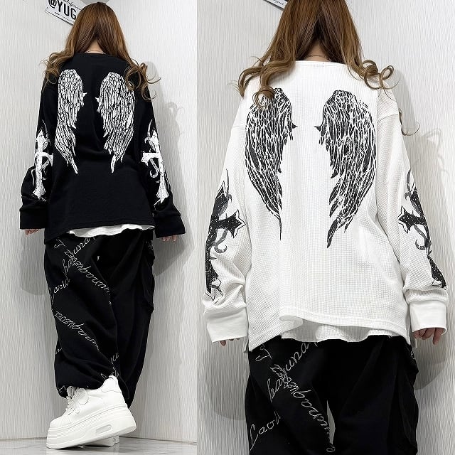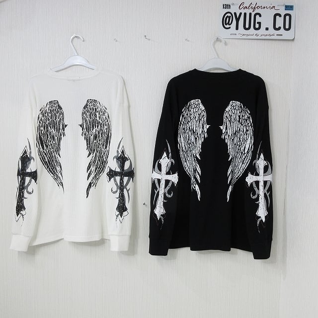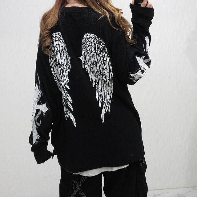 Back フェザー 翼 バクプリ 袖クロス ワッフル ロンT