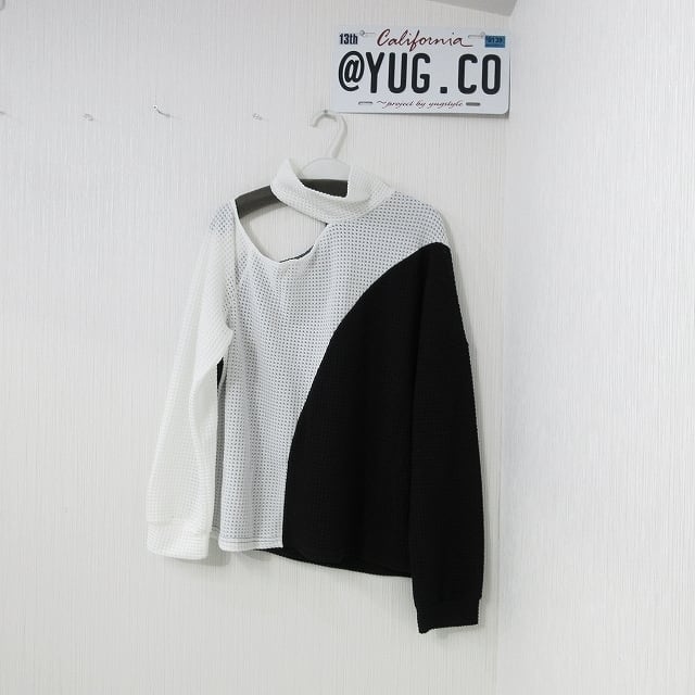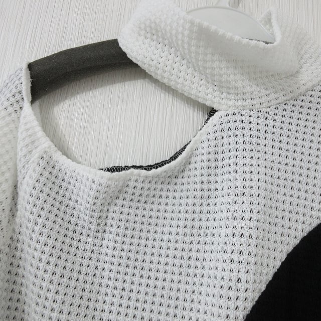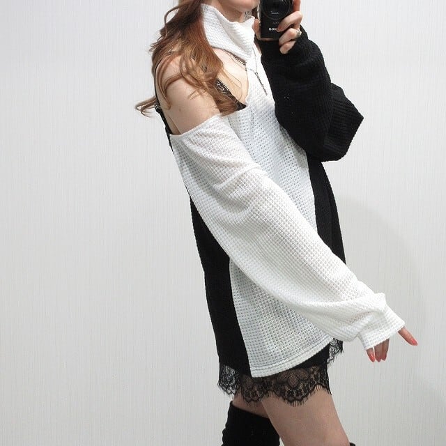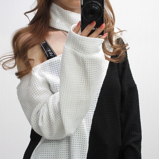 肩見せ 肩開き チョーカー一体型 ワッフル編み バイカラー 配色 ニット チュニック
