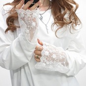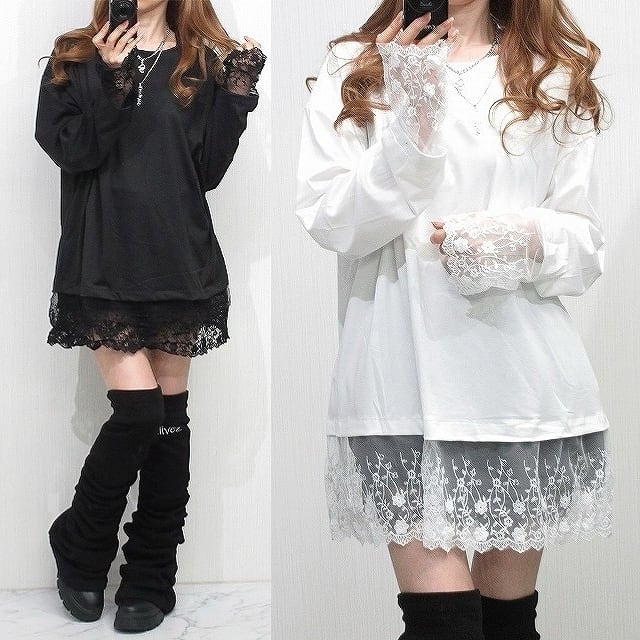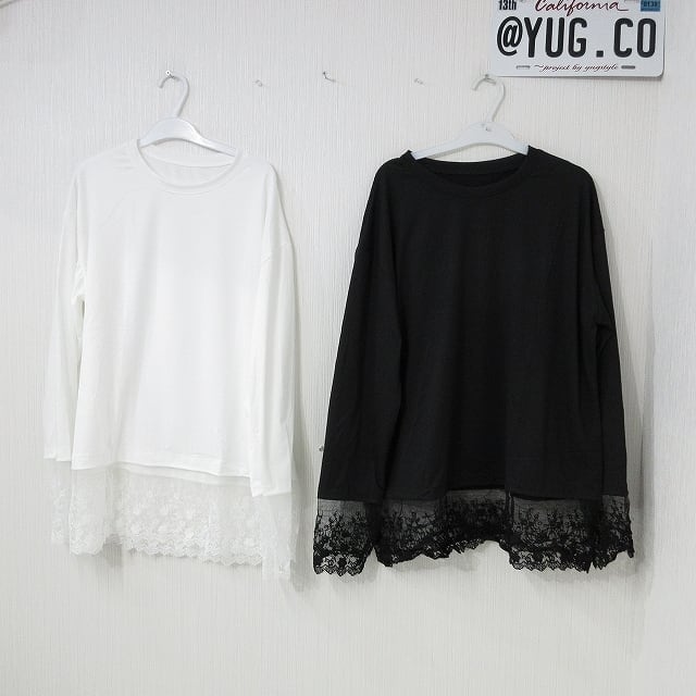 クロシェ刺繍 裾袖レース 切替 チュニック ロンT