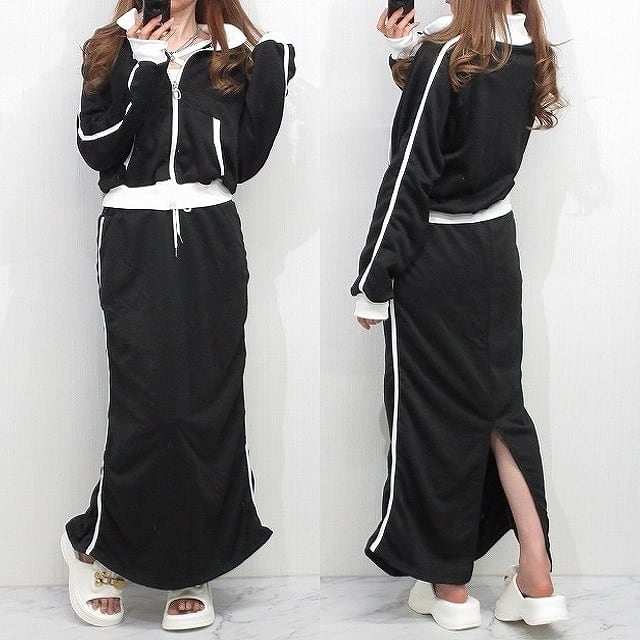 【SET UP】ハイネック バイカラー配色切替 ジャケットTops&ロンスカ 後ろスリット 上下SET
