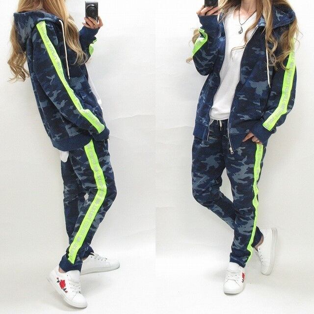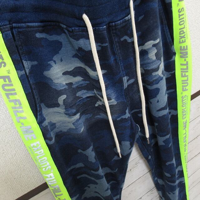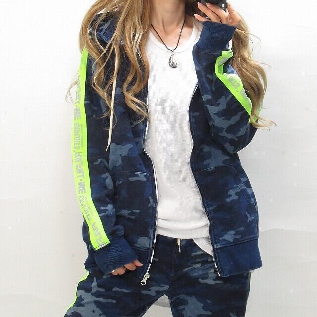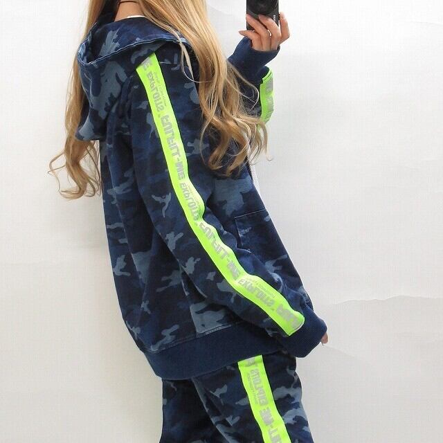 【SET UP】 カットデニム パーカー×ジョガーパンツSET販売 Sideネオン×テープロゴ 迷彩 ライム