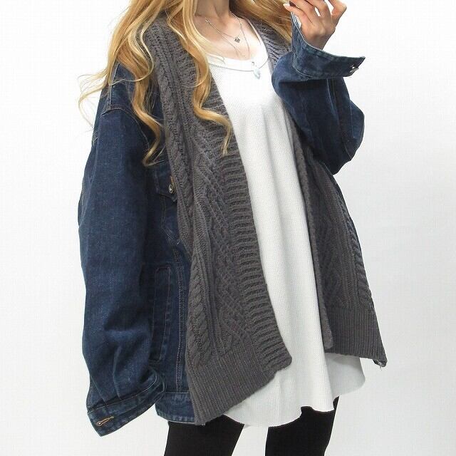 デニム切替 ケーブルニット パッチワーク風 インポート デニムジャケット カーディ オーバーサイズ ブルー