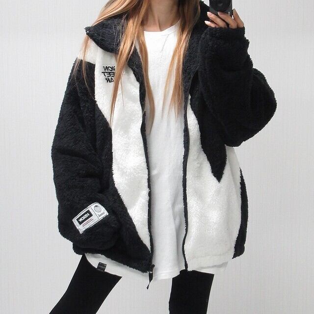 サプライズ価格♪ 配色切替 ロゴ刺繍&袖パッチ ハイネックZIP ふわふわ ボアジャケット アウター オーバーサイズ ホワイト