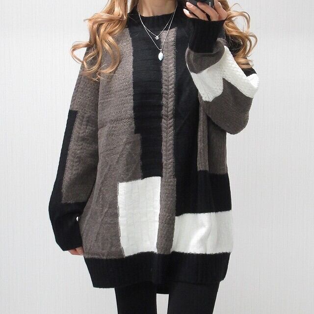 配色切替 パネル配色 あったか肉厚 セレブ 上質ニット プルオーバー モカ