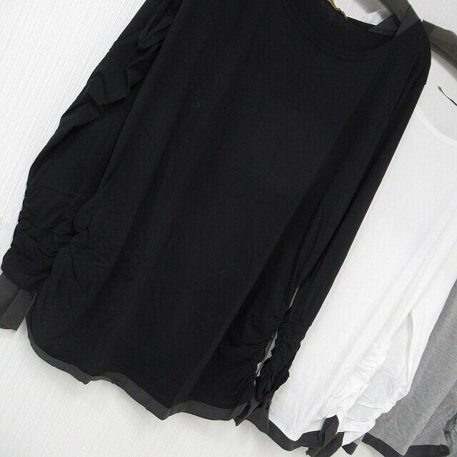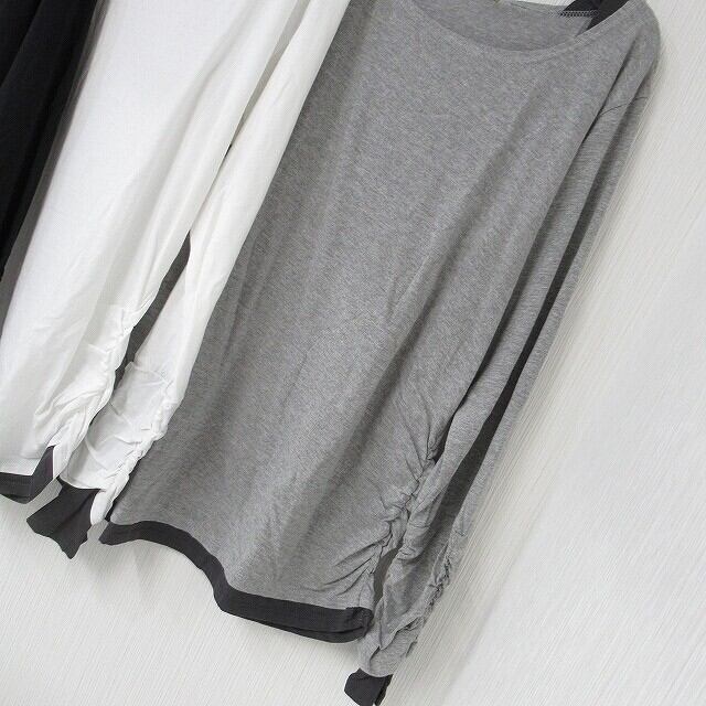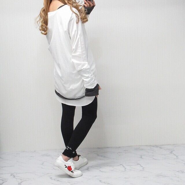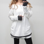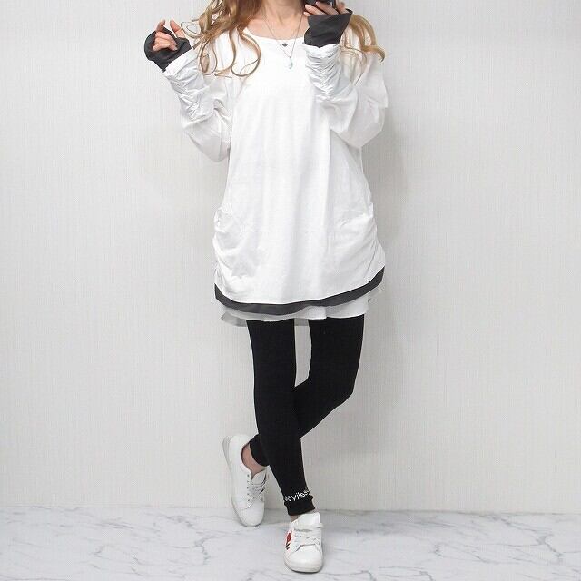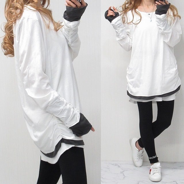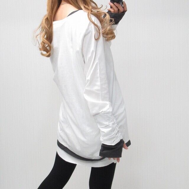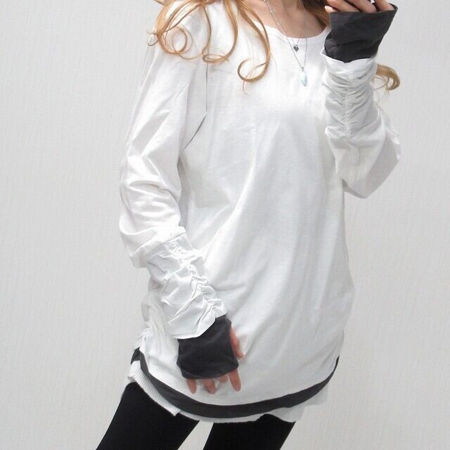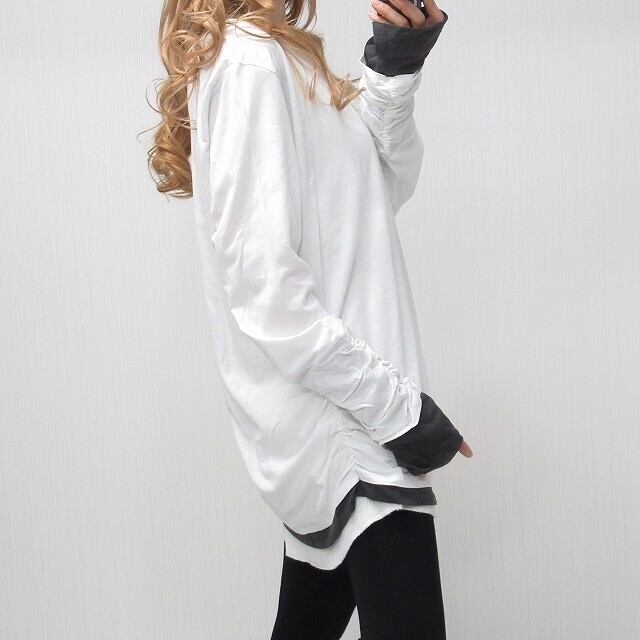 指穴あき 袖クシュクシュ 丈長ロンT 1枚で重ね着風 レイヤード ホワイト