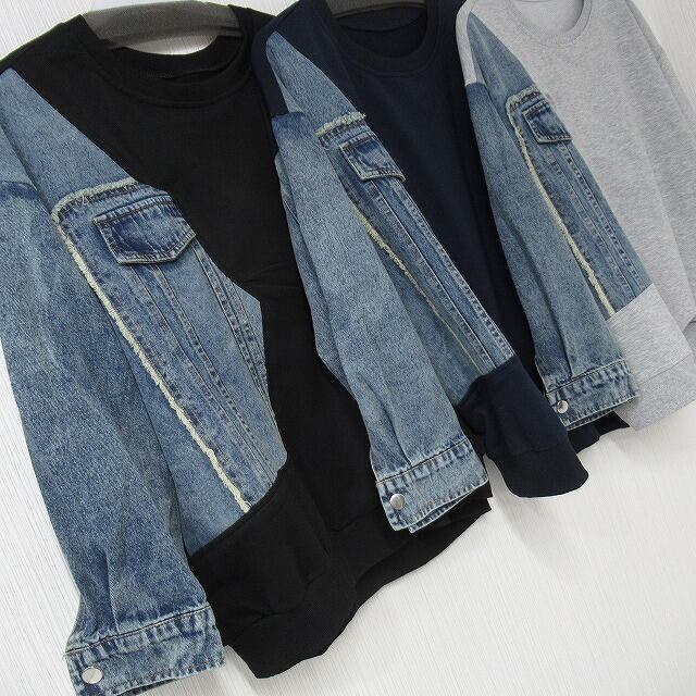 デニム切替スウェットのパッチワークデザインがオシャレ感抜群♪♪