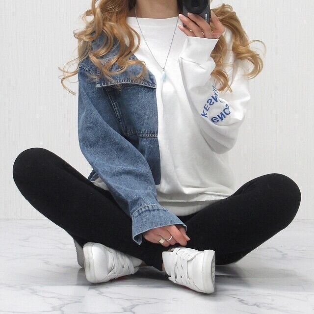デニム切替スウェット 袖ロゴ刺繍 綿100% パッチワーク トレーナー プルオーバー ホワイト