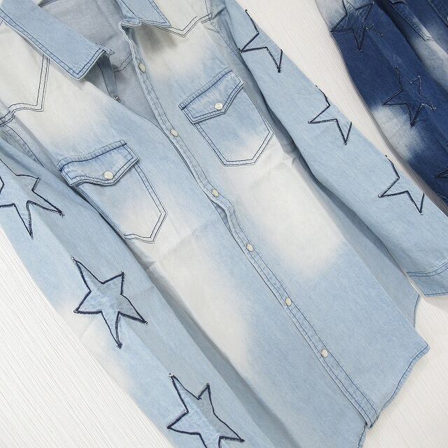 星柄 袖刺繍 ビンテージ デニムシャツ 綿100% インディゴ