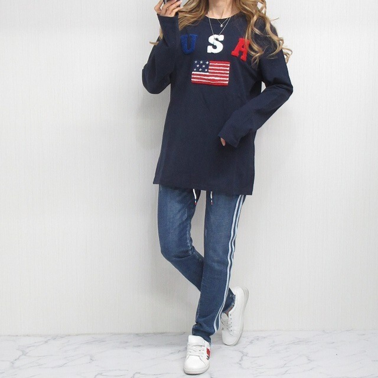 USA 星条旗 サガラ刺繍 ロンT ネイビー