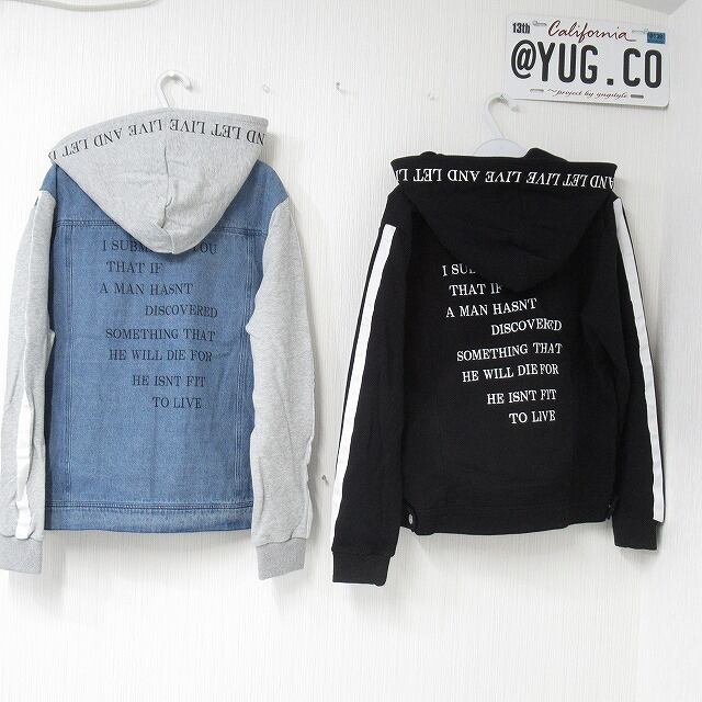 スウェット切替デニム生地でBIGフードには裏表ロゴ使いが◎