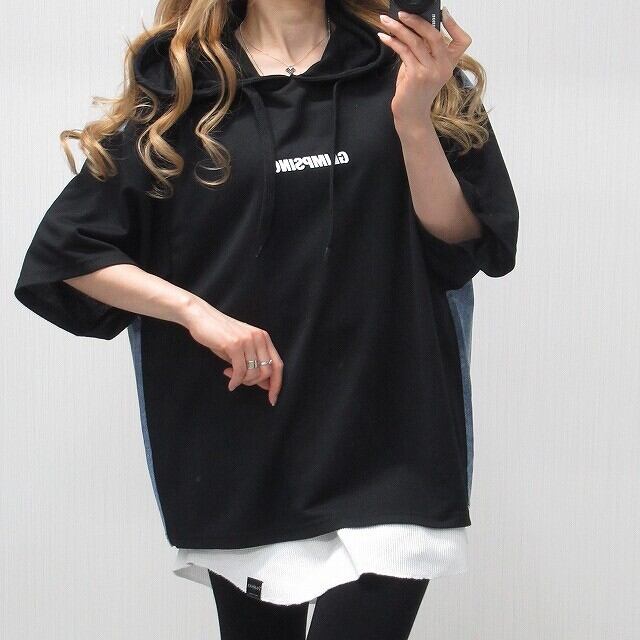 デニム切替スウェット バックロゴ BIGパーカー サックス