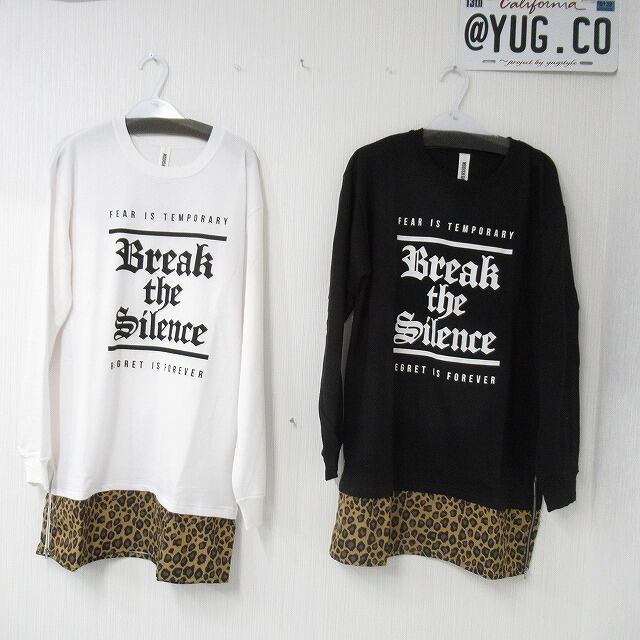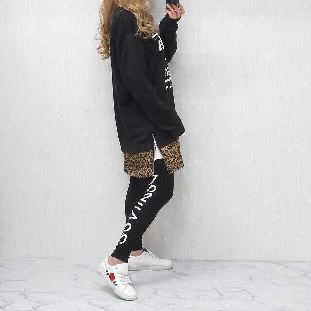 裾レイヤード ヒョウ柄 Side ZIP 配色切替 トレーナー ブラック