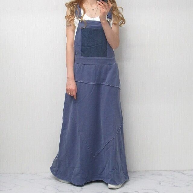 ビンテージ ピグメント加工 ポケット付 デニム切替 スウェット サロペ マキシワンピース ネイビー