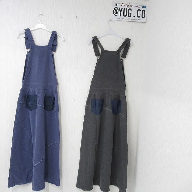 ビンテージ ピグメント加工 ポケット付 デニム切替 スウェット サロペ マキシワンピース ブラック