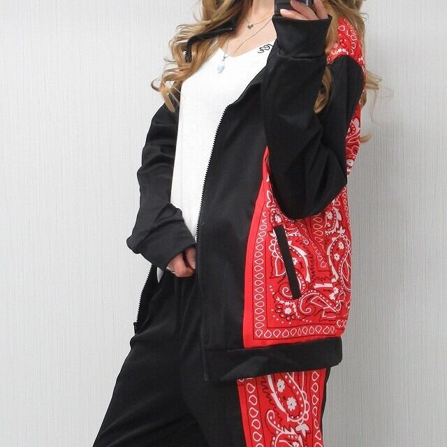 【SET UP】ストリート ペイズリー柄 配色切替 ZIPブルゾン&パンツ 上下セットアップ インポート レッド