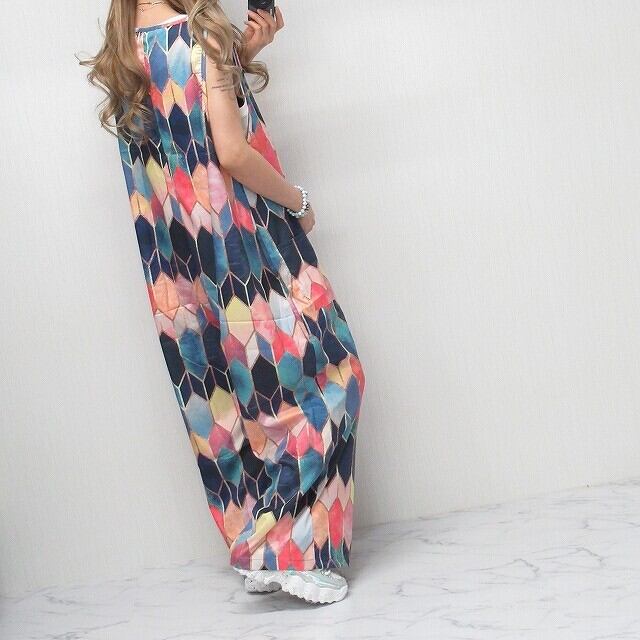 虹色 ムラ染め グラデーション オールインワン サロペ ピンク