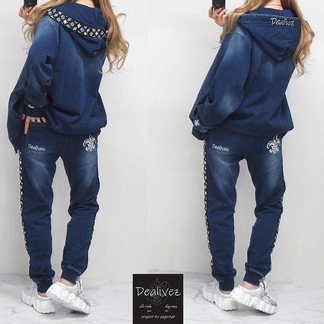 【Dealivez】カットデニム モノグラム インサイド テープロゴ 刺繍 ZIPパーカー インディゴ×ブラック