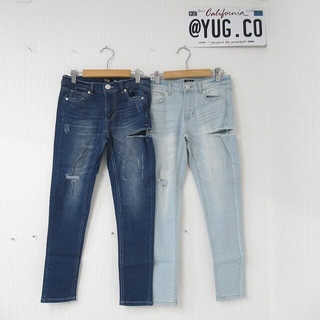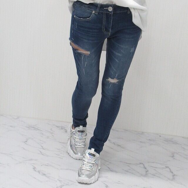 【3size】肌魅せ Sideダメージ 美脚脚長 ストレッチ スキニーデニム インディゴ