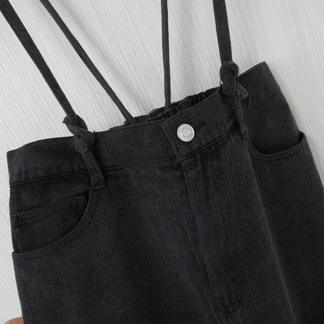 Back編み上げ ワイドデニム 美脚脚長 BOYSデニム サスペ紐付き ワイドパンツ ブラックデニム