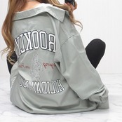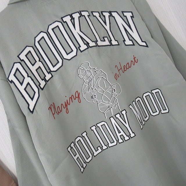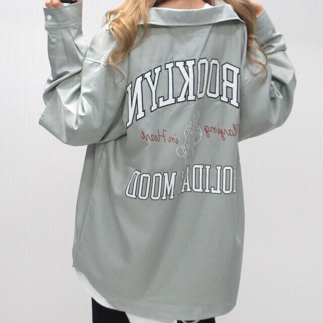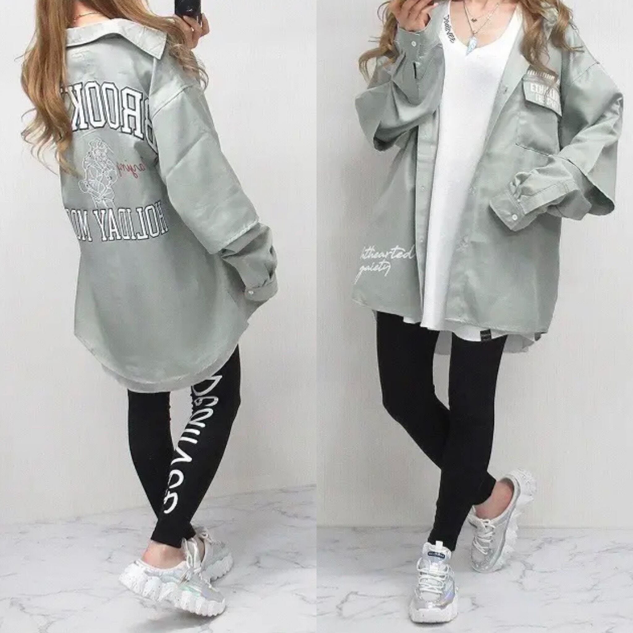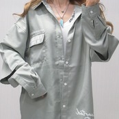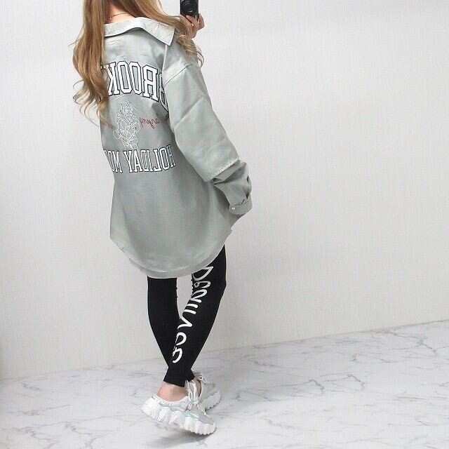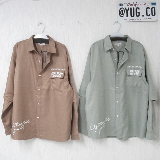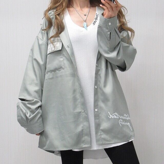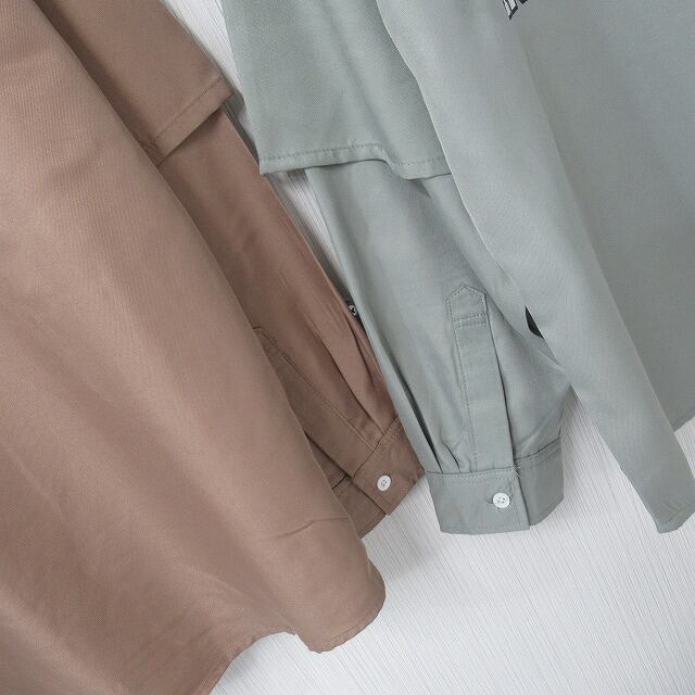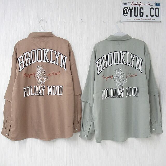 ストリート バックロゴ サガラ刺繍 胸ポケロゴ 重ね着 BIGシルエット オーバーシャツ くすみグリーン