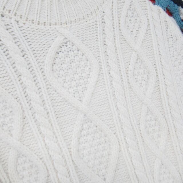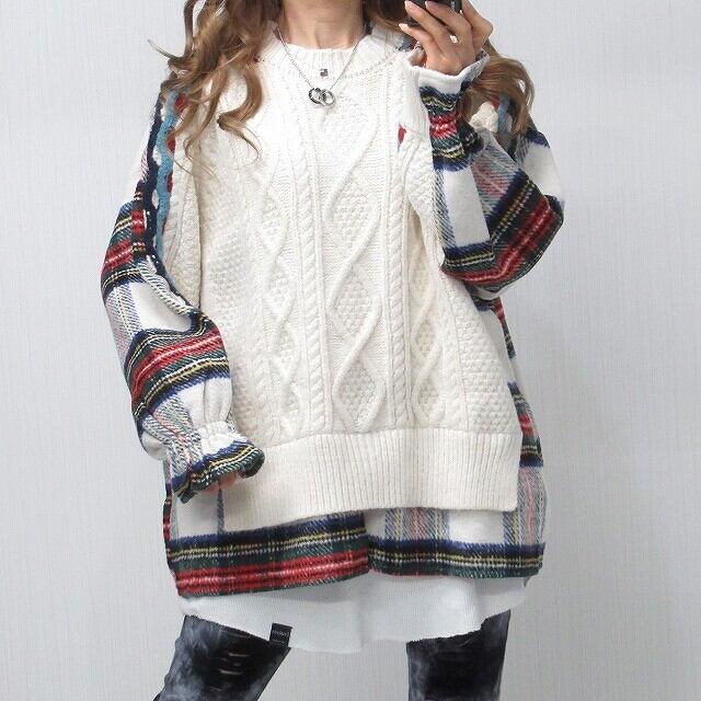 ざっくり ケーブル編み 切替 レイヤード チェック柄 起毛シャツ プルオーバー アイボリー