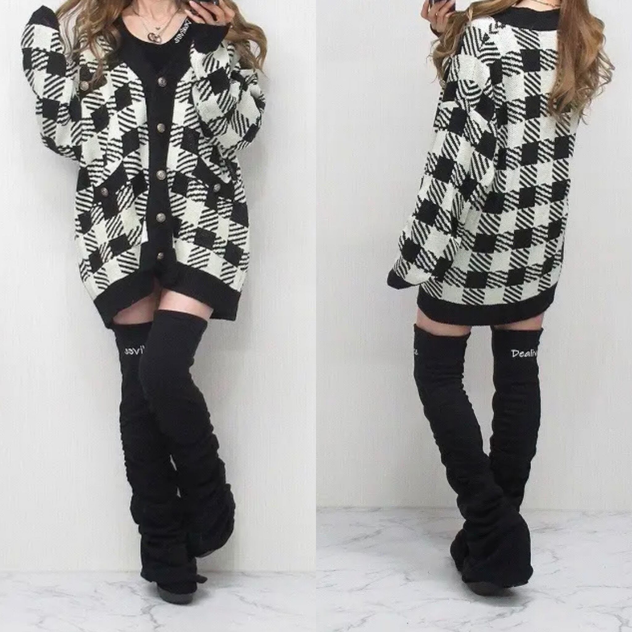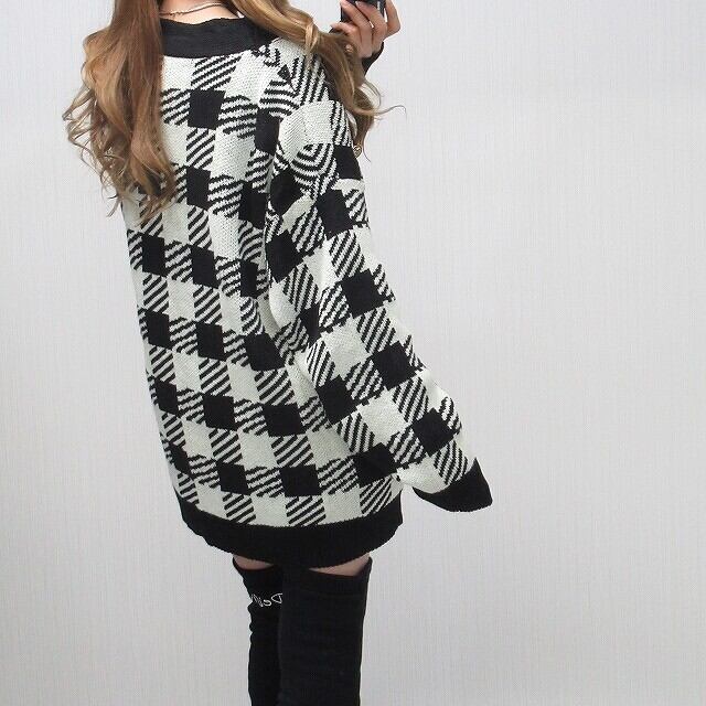 ブロックチェック柄 ジャガード 彫刻ボタン ざっくりニット カーディガン ブラック