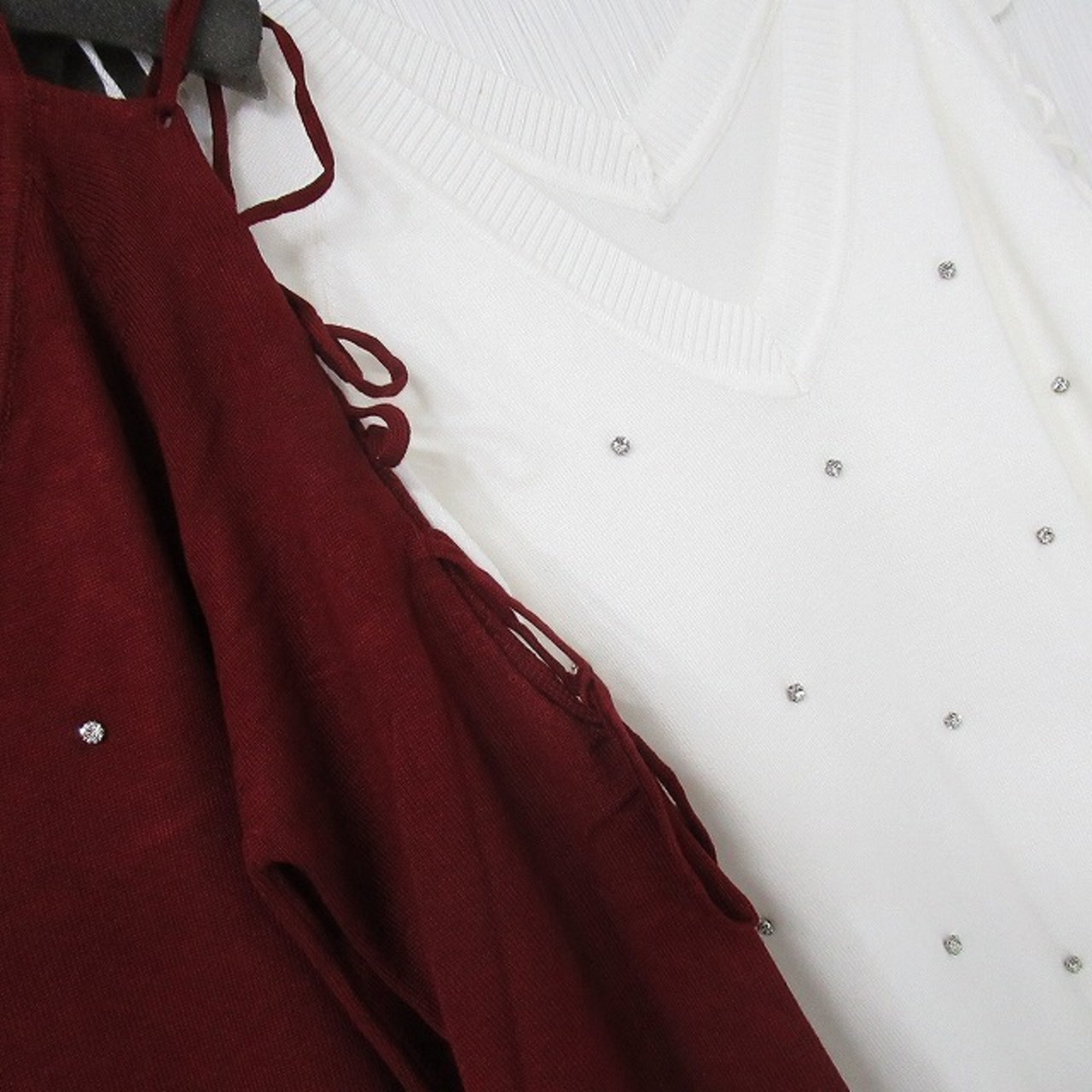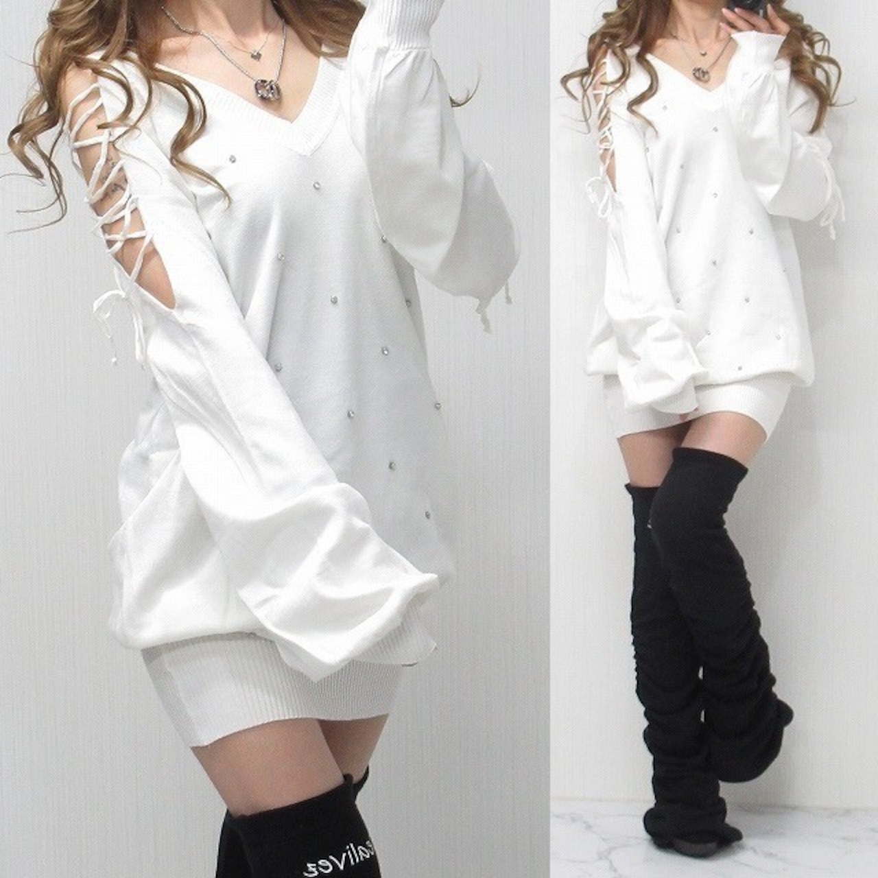 袖編み上げ 肌魅せ 大粒ストーン散りばめ 上品コクーン ニット ワンピース ホワイト