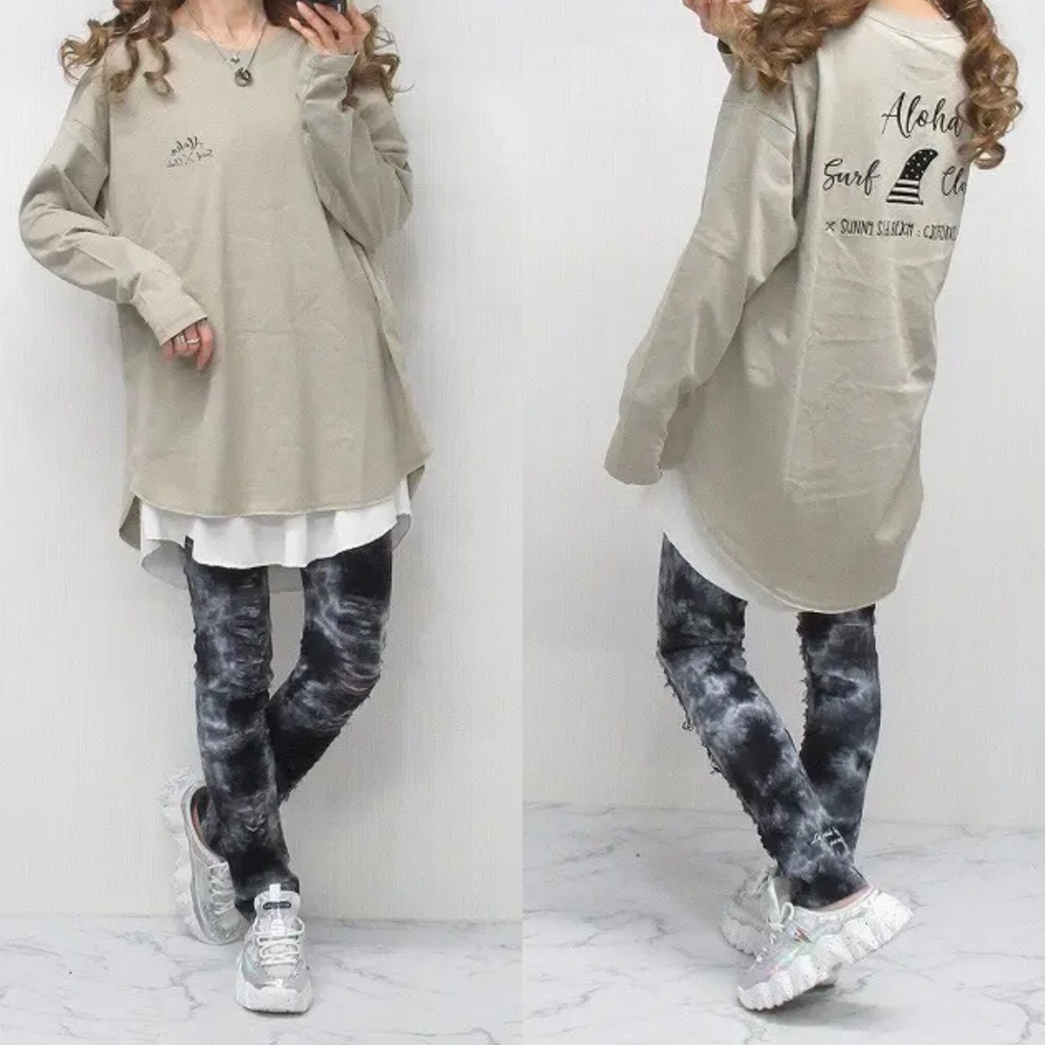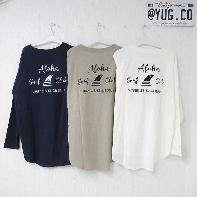 ALOHA ラウンドカット ロング丈 背中ALL刺繍 アメカジ surf ロンT グレージュ